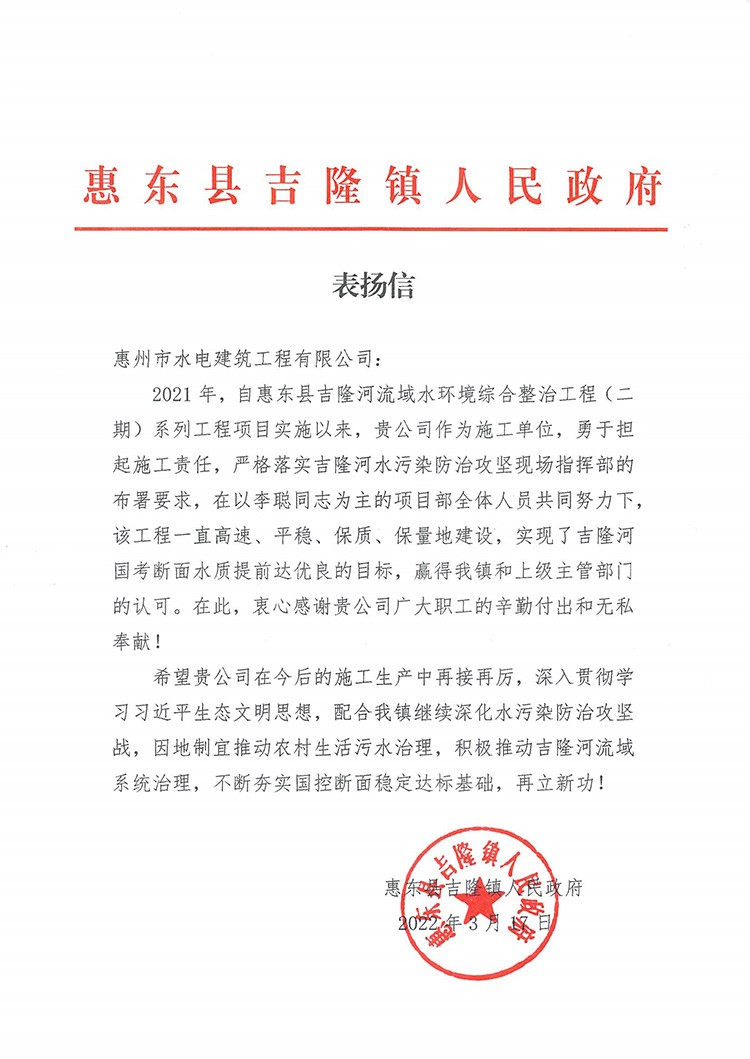 近日,我司從惠東縣吉隆鎮(zhèn)人民政府收到表揚(yáng)信,對我司在承建的惠東縣吉隆河流域水環(huán)境綜合整治(二期)系列工程施工中勇于擔(dān)當(dāng)作為,嚴(yán)格落實(shí)部署要求,高速、平穩(wěn)、保質(zhì)、保量完成施工任務(wù),提前實(shí)現(xiàn)吉隆河國考斷面水質(zhì)達(dá)優(yōu)良目標(biāo)表示衷心感謝。惠東縣吉隆河流域水環(huán)境綜合整…......