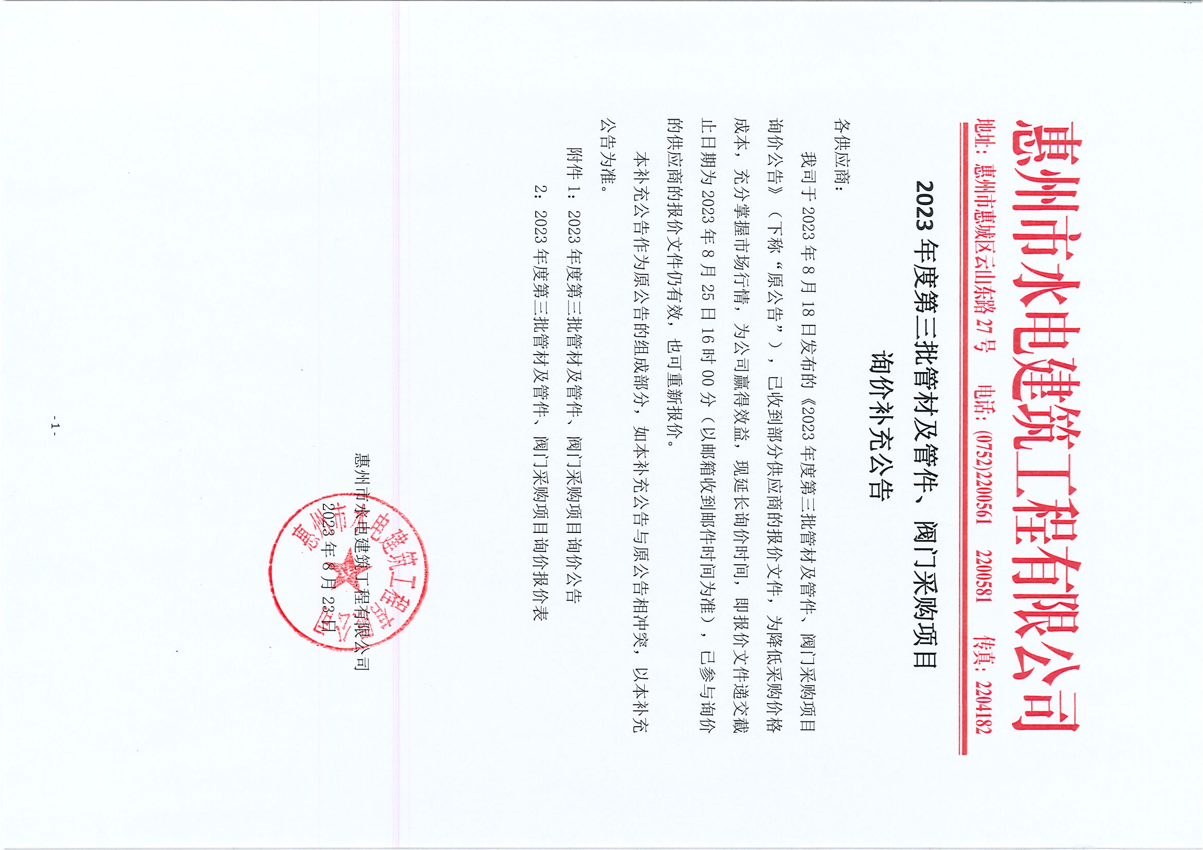 2023年度第三批管材及管件、閥門采購項(xiàng)目詢價補(bǔ)充公告