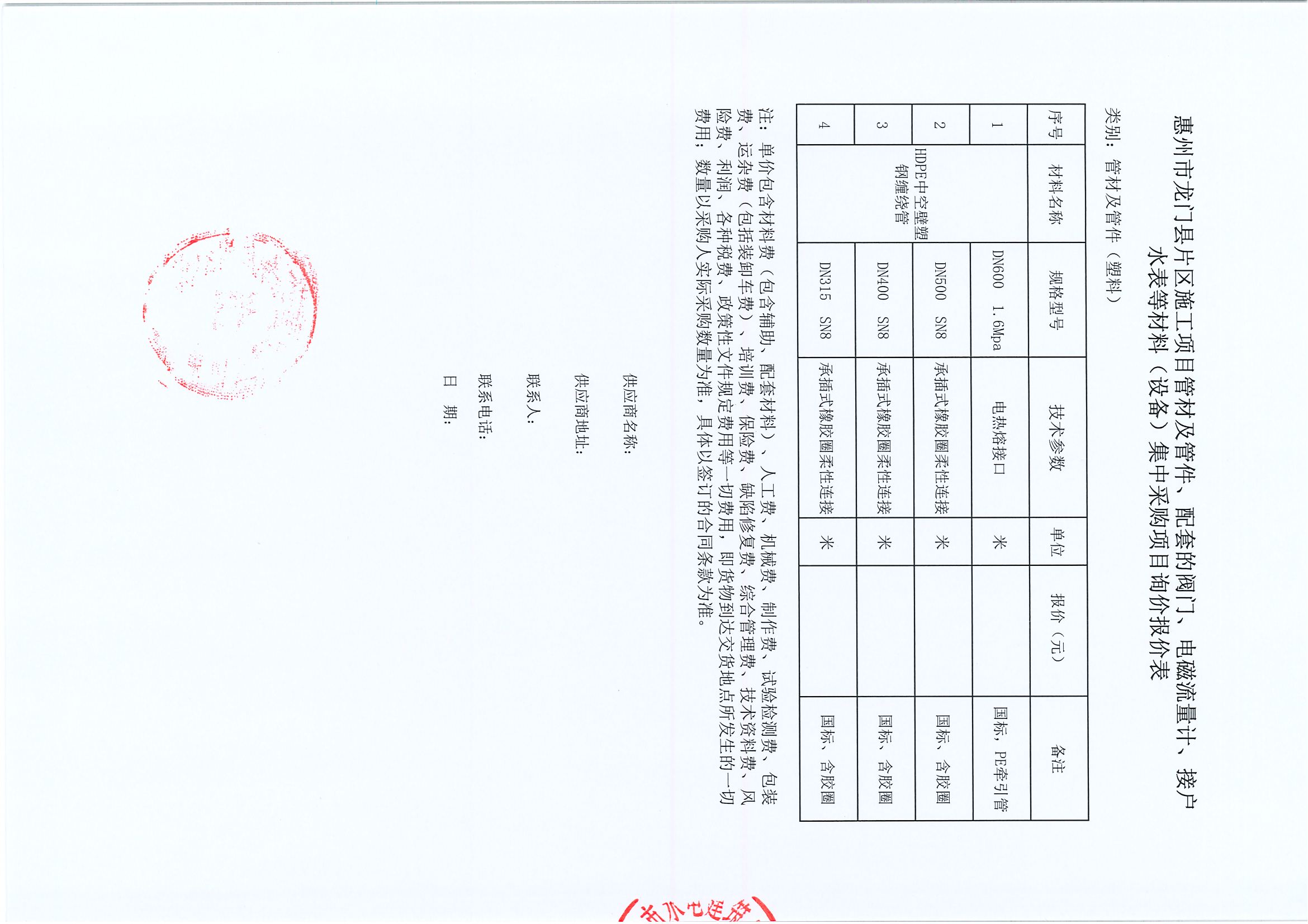惠州市龍門縣片區(qū)施工項目管材及管件集中采購項目詢價公告
