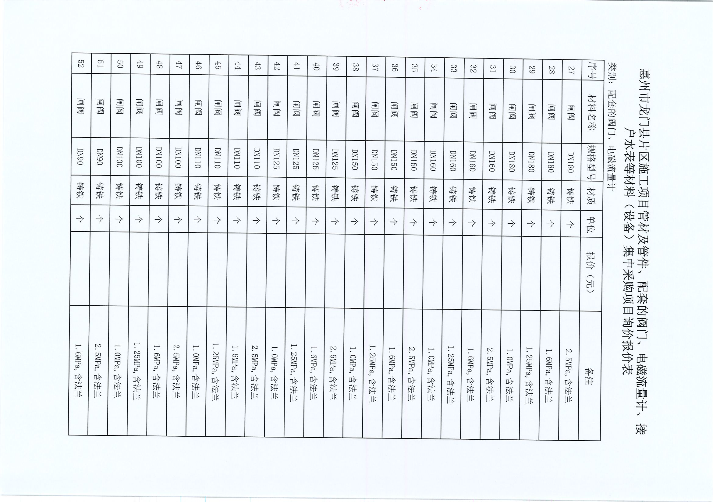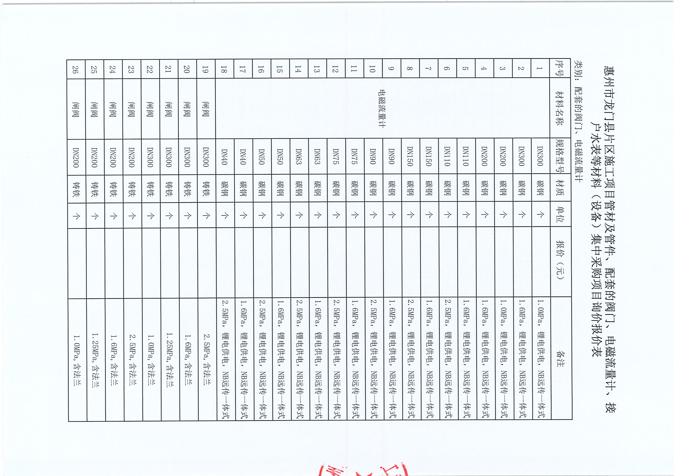 惠州市龍門縣片區(qū)施工項目管材及管件、配套的閥門、電磁流量計、接戶水表等材料(設備)集中采購項目詢價公告