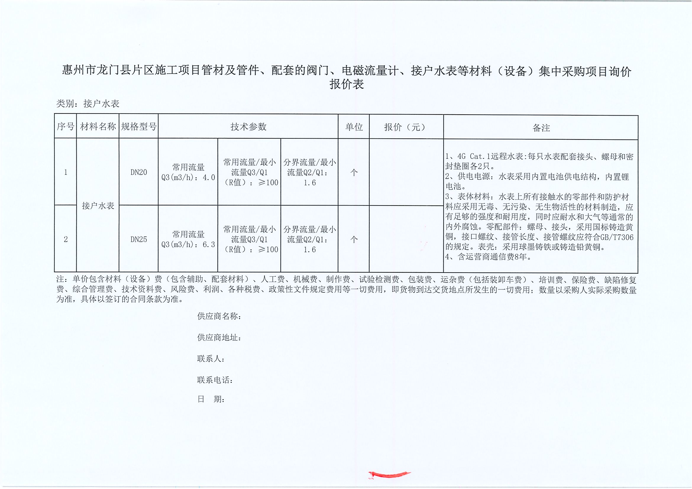 惠州市龍門縣片區(qū)施工項目接戶水表集中采購項目詢價公告