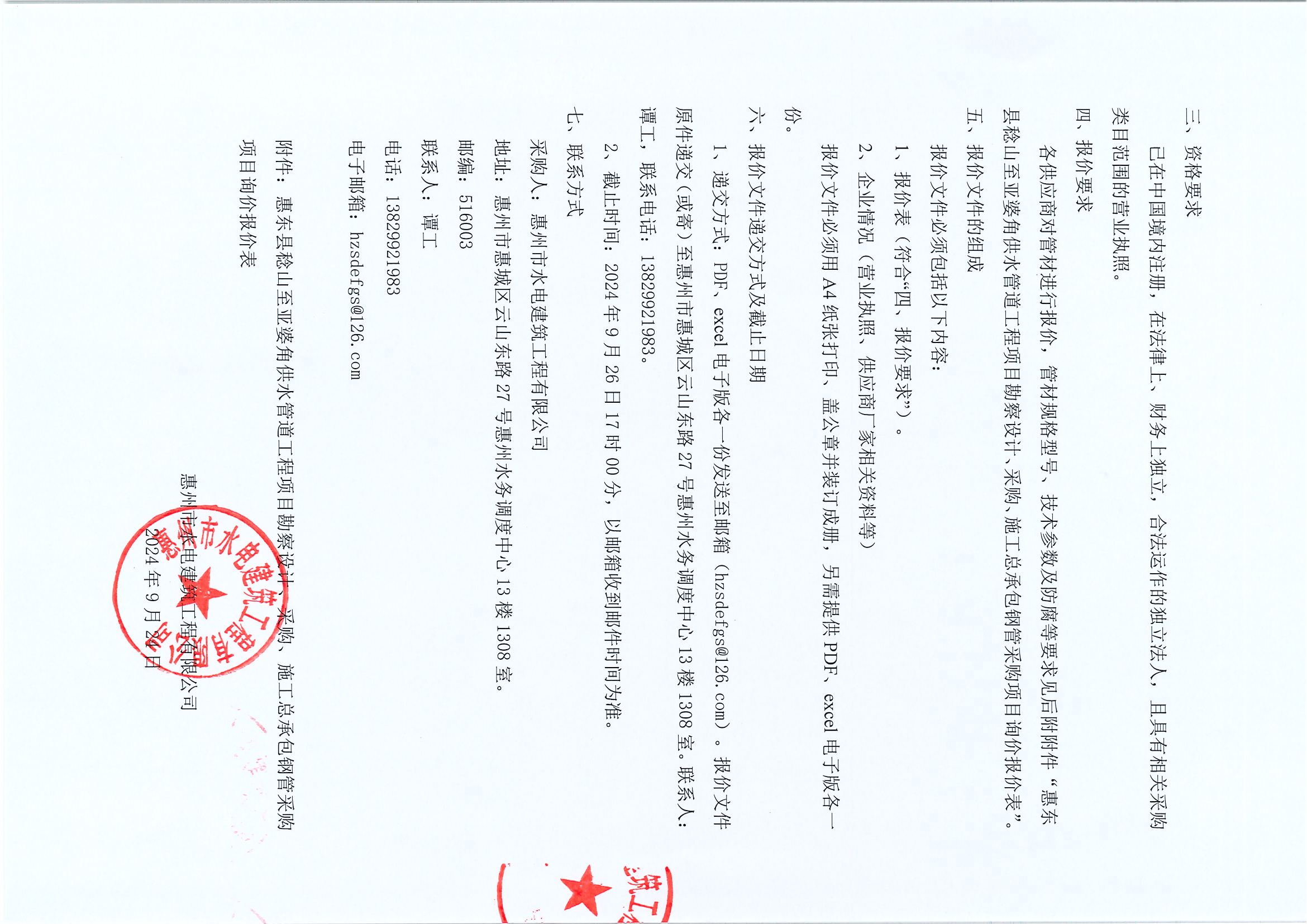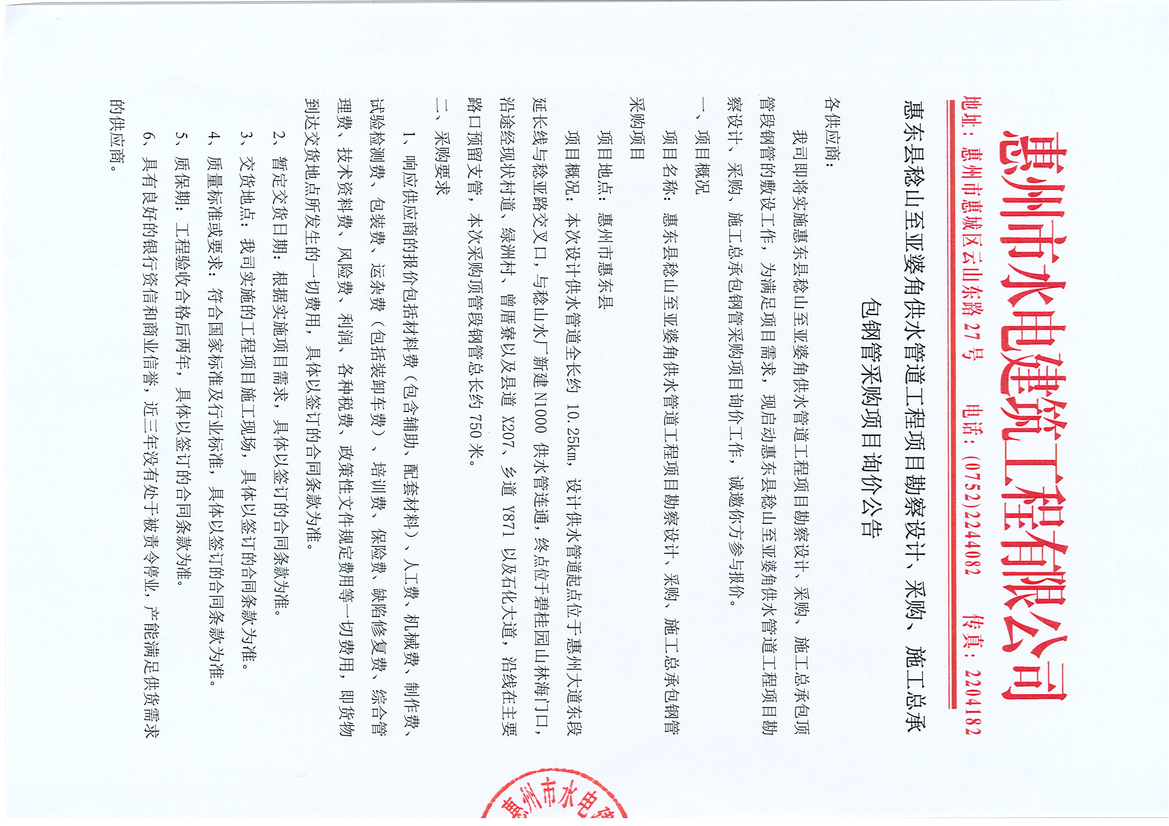惠東縣稔山至亞婆角供水管道工程項目勘察設(shè)計、采購、施工總承包鋼管采購項目詢價公告