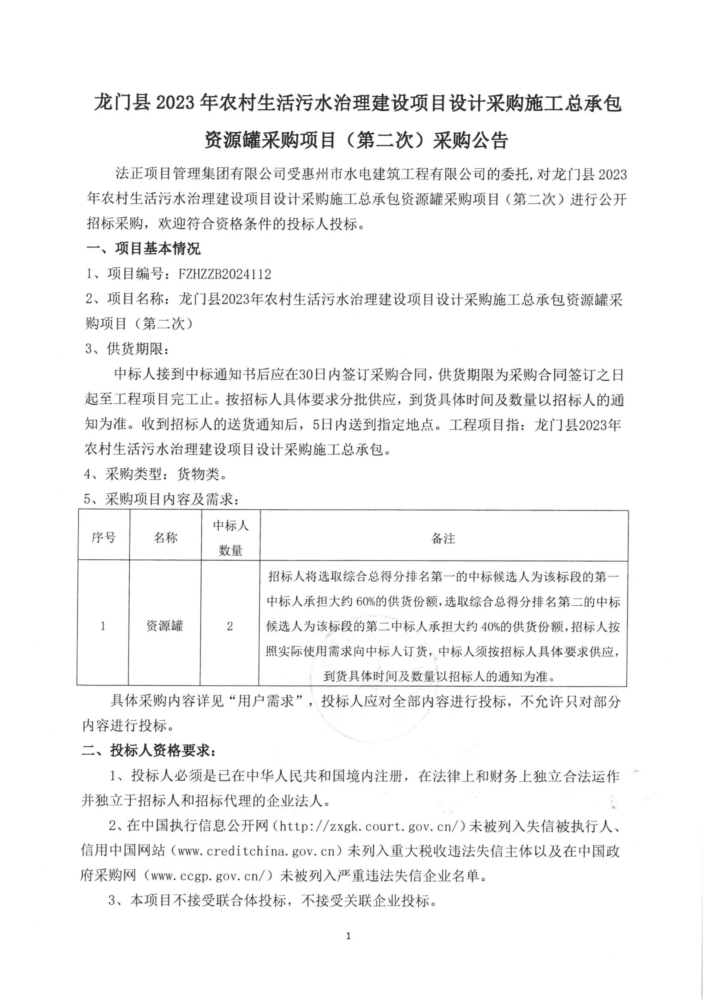 龍門縣2023年農(nóng)村生活污水治理建設項目設計采購施工總承包資源罐采購項目(第二次)采購公告