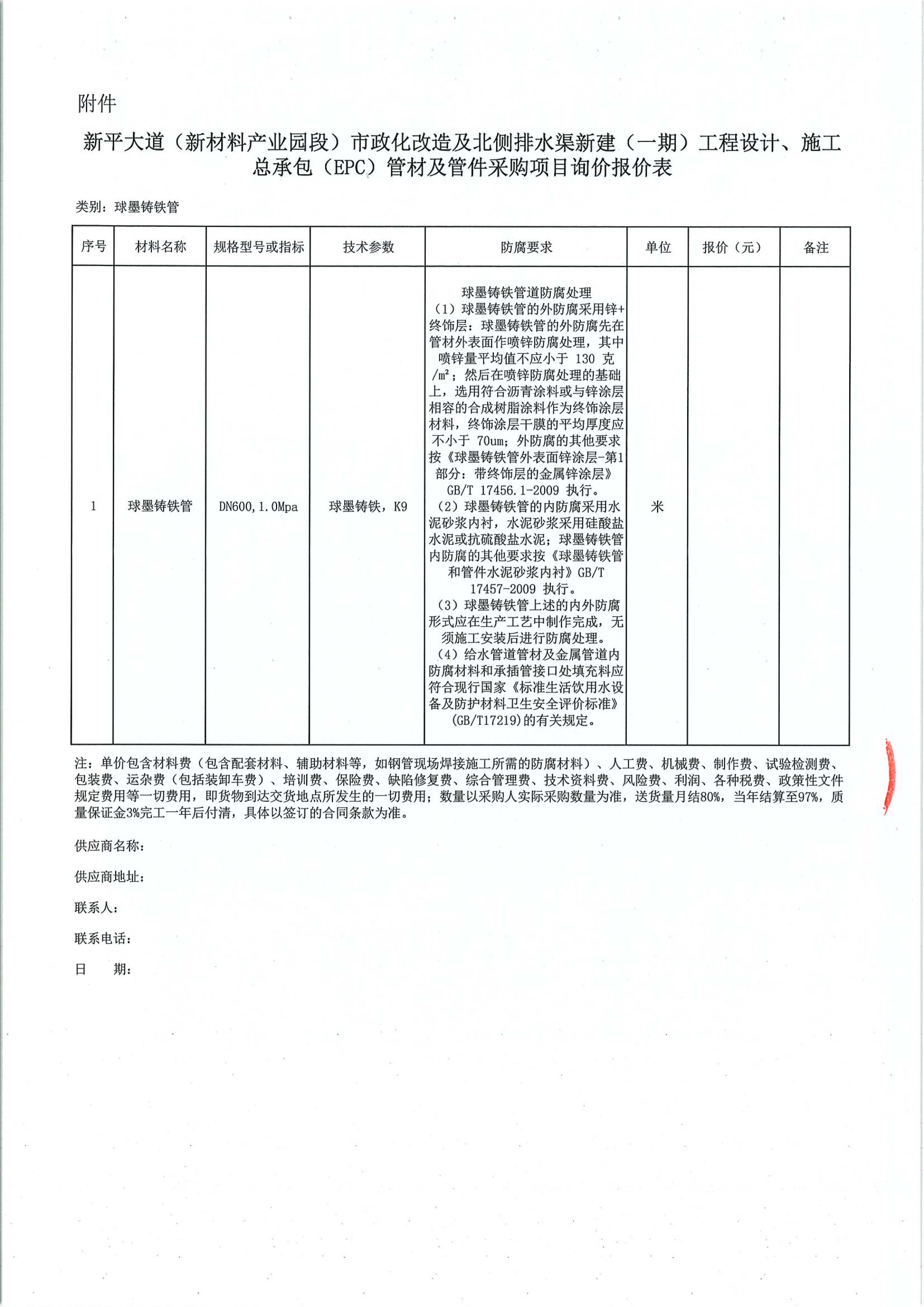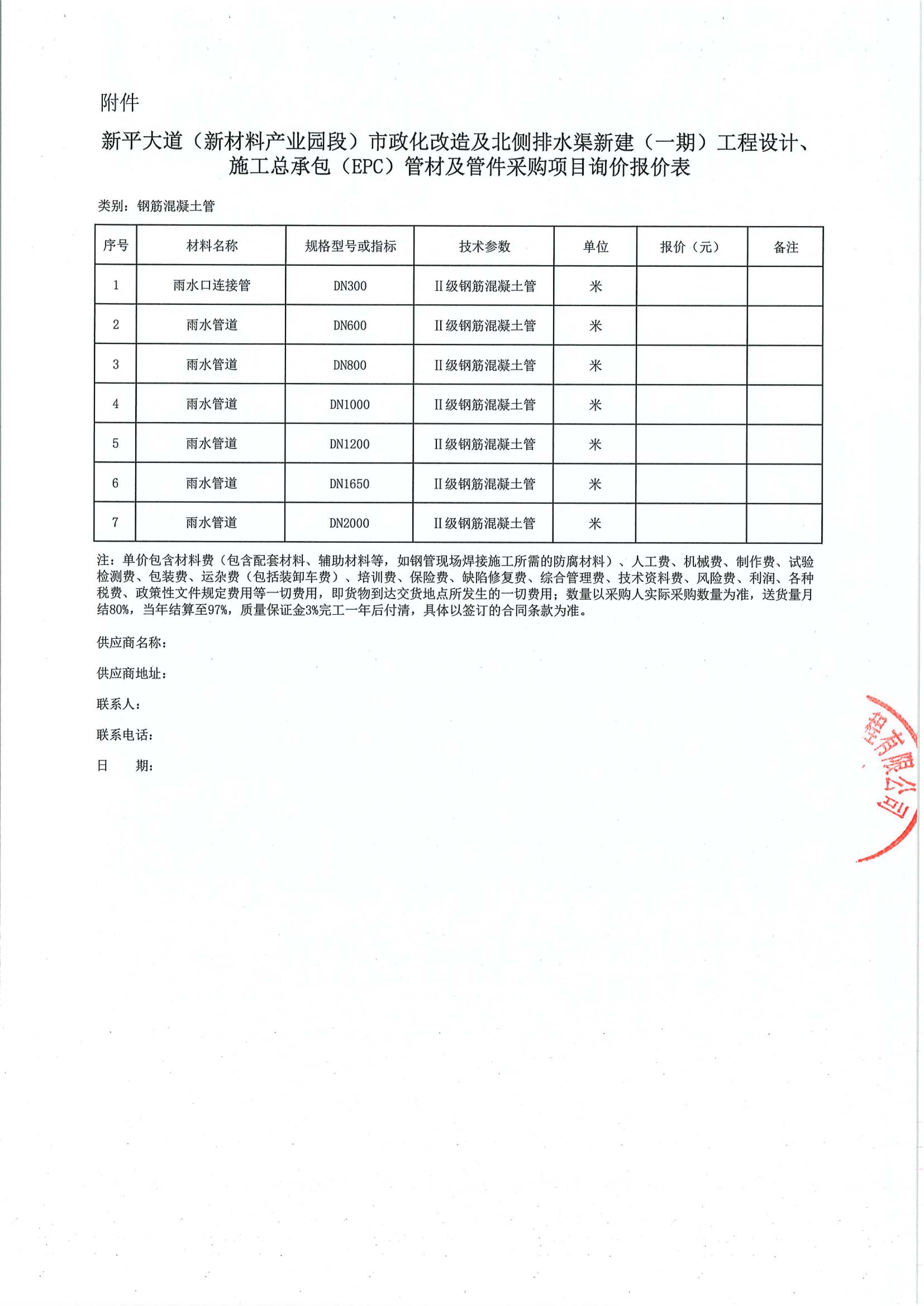 新平大道(新材料產(chǎn)業(yè)園段)市政化改造及北側(cè)排水渠新建(一期)工程設(shè)計、施工總承包(EPC)管材及管件采購項目詢價公告附件: