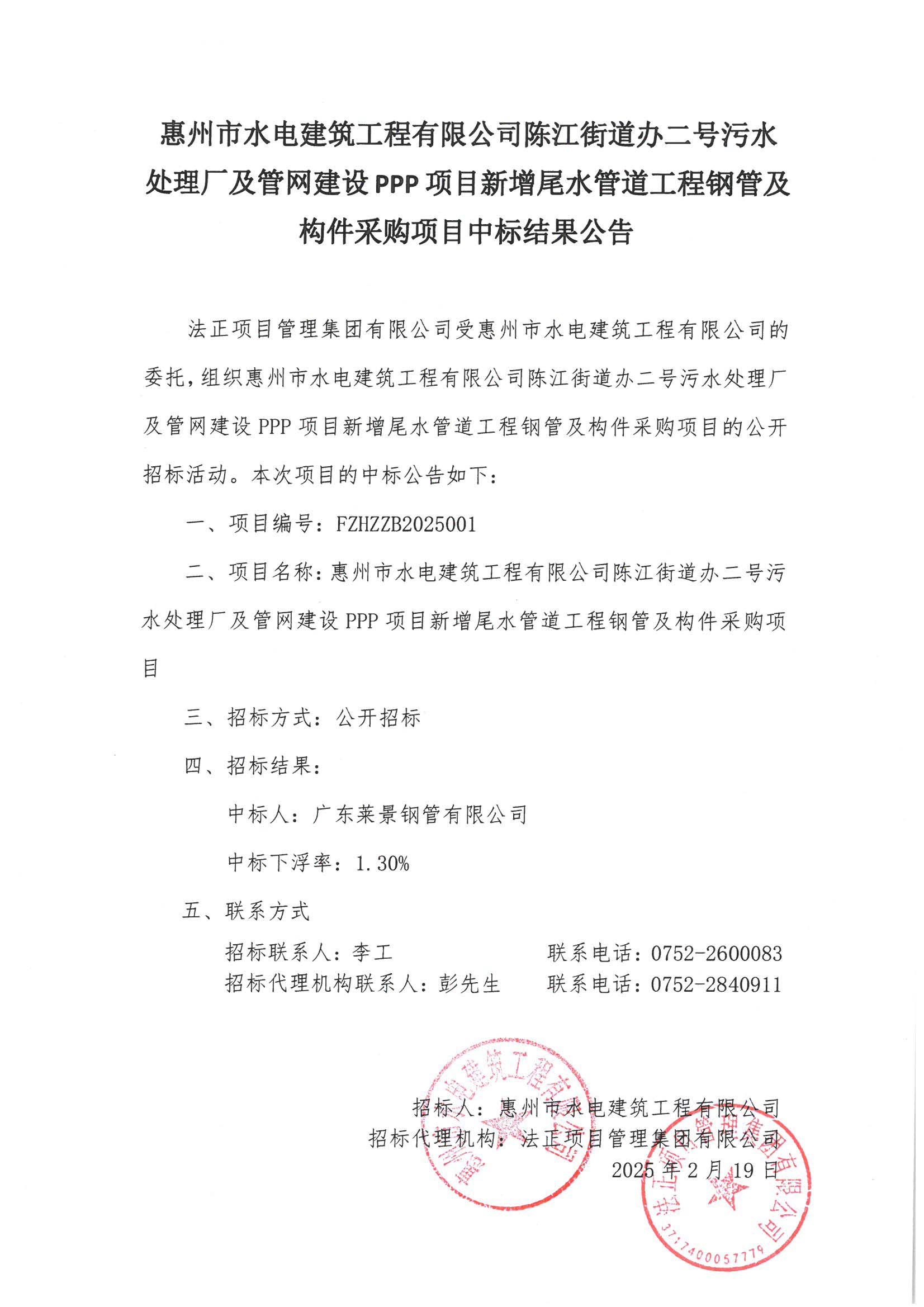 陳江街道辦二號污水處理廠及管網(wǎng)建設(shè)PPP項(xiàng)目新增尾水管道工程鋼管及構(gòu)件采購項(xiàng)目中標(biāo)結(jié)果公告
