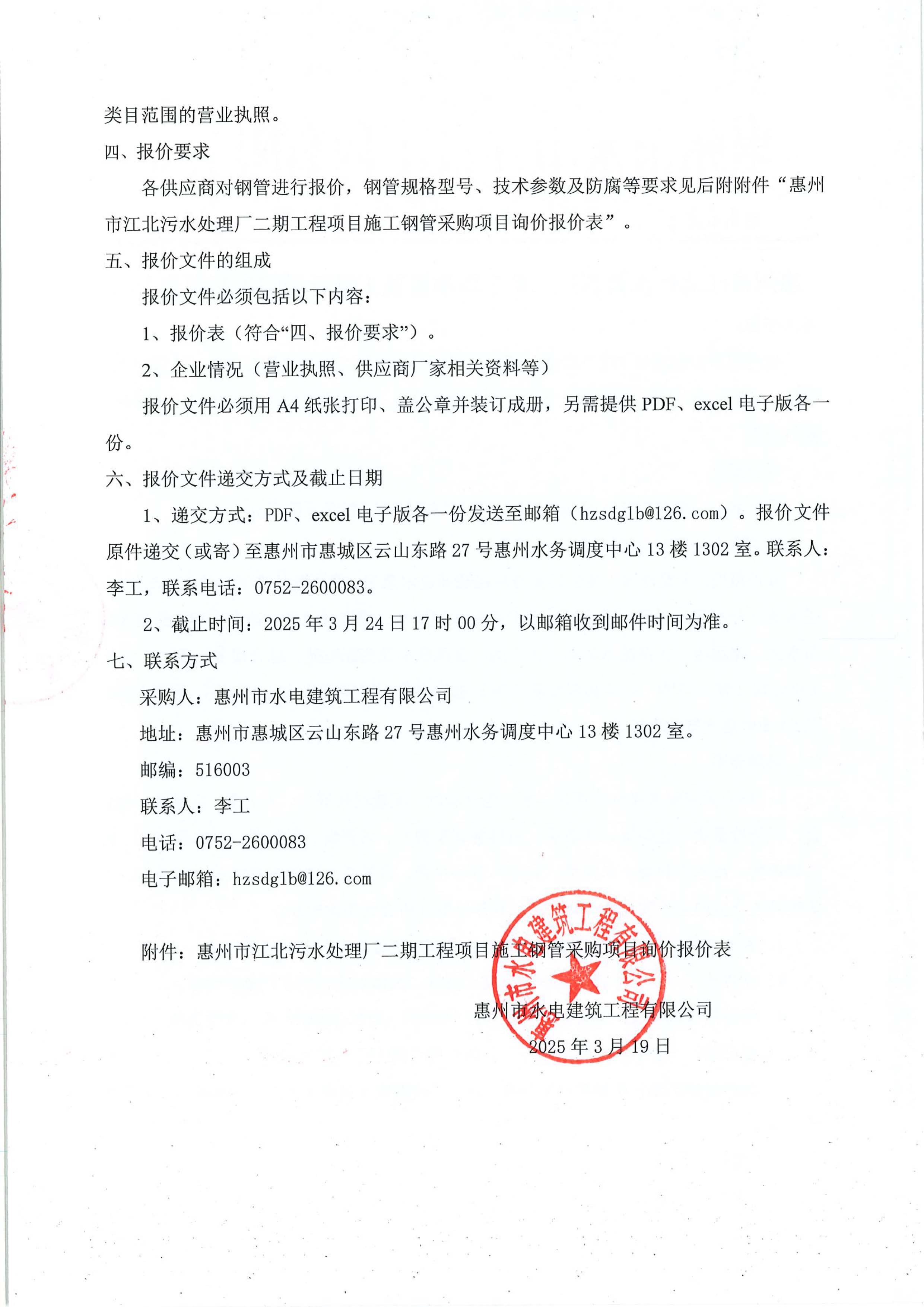 惠州市江北污水處理廠二期工程項(xiàng)目施工鋼管采購(gòu)項(xiàng)目詢(xún)價(jià)公告附件: