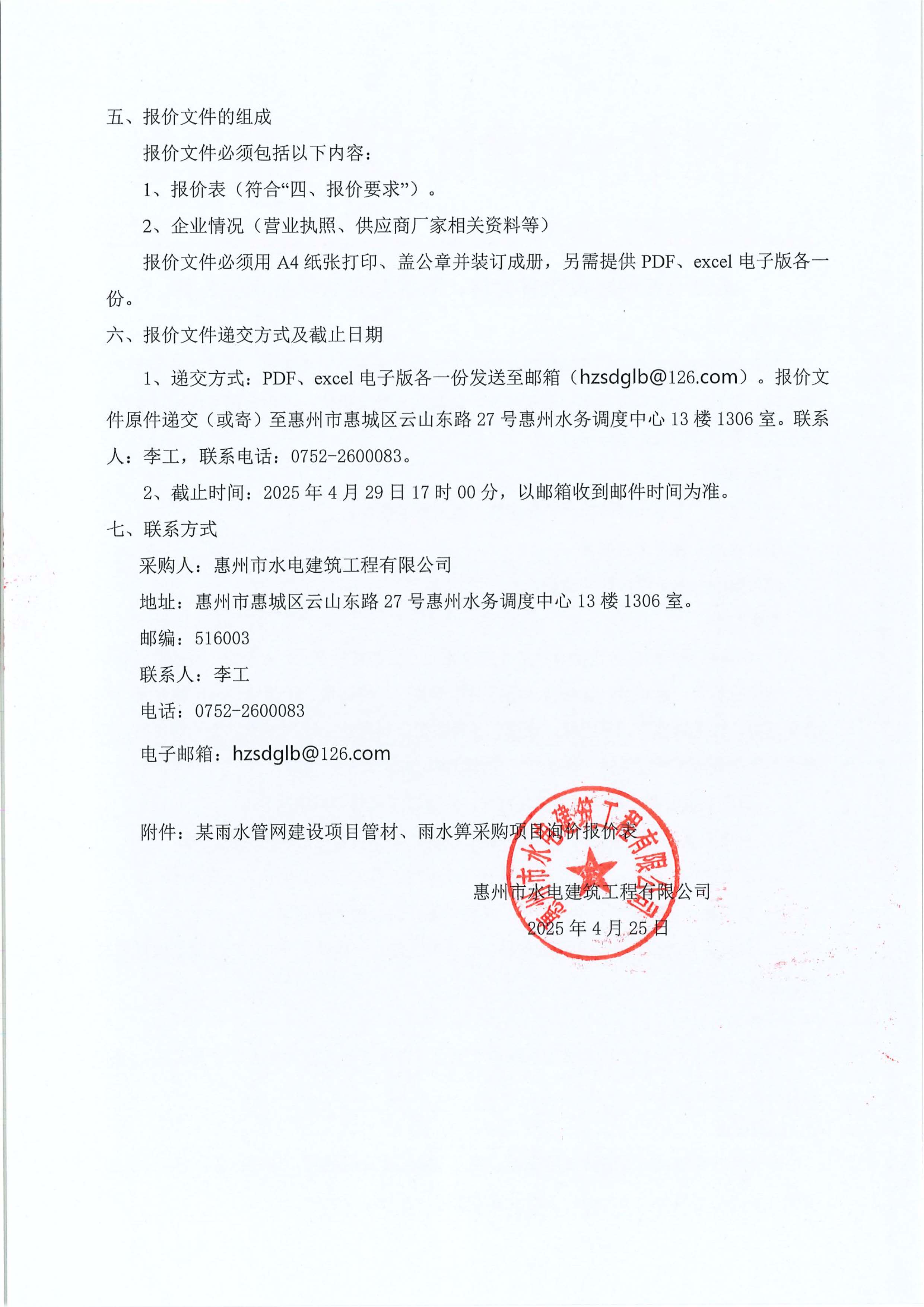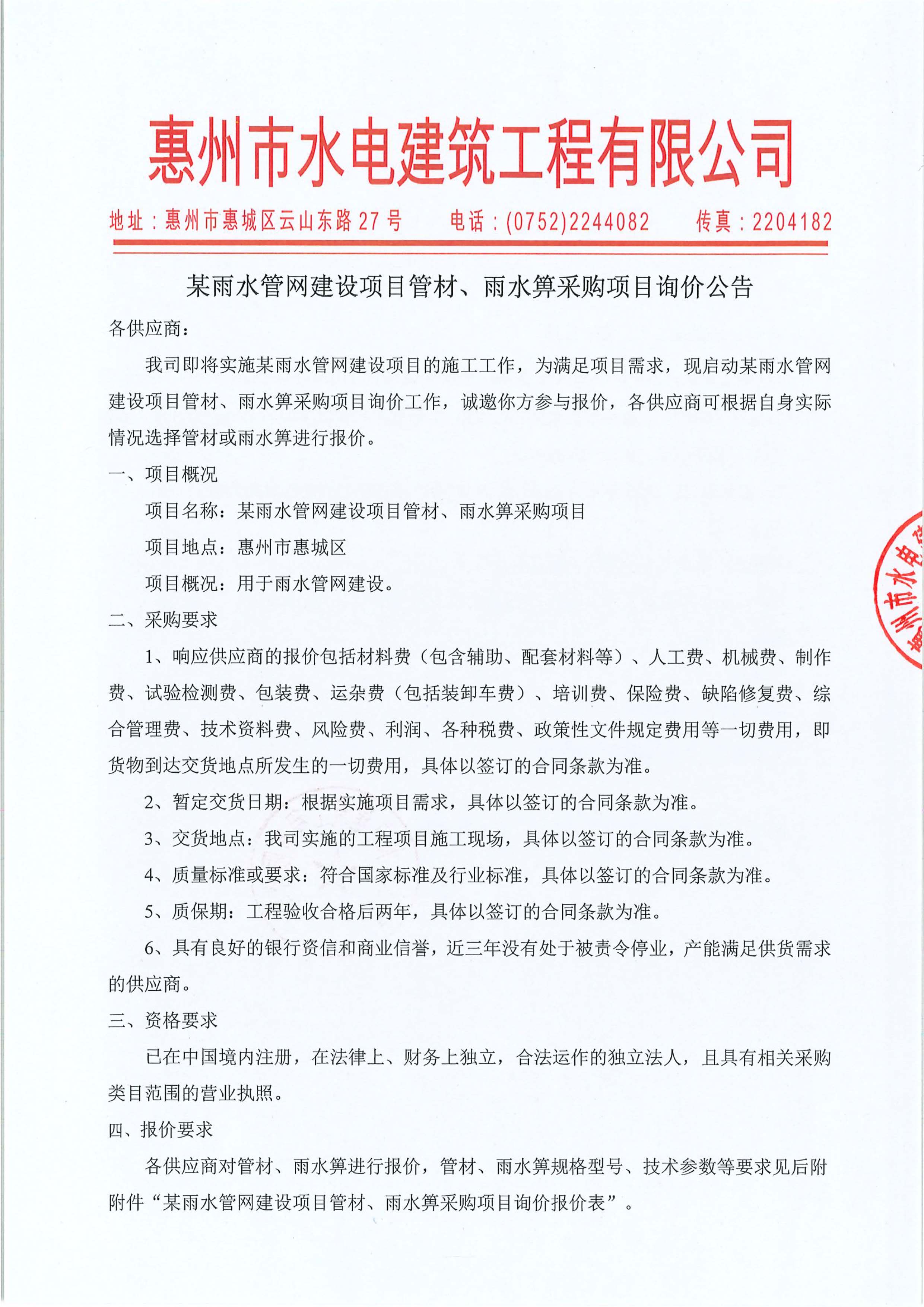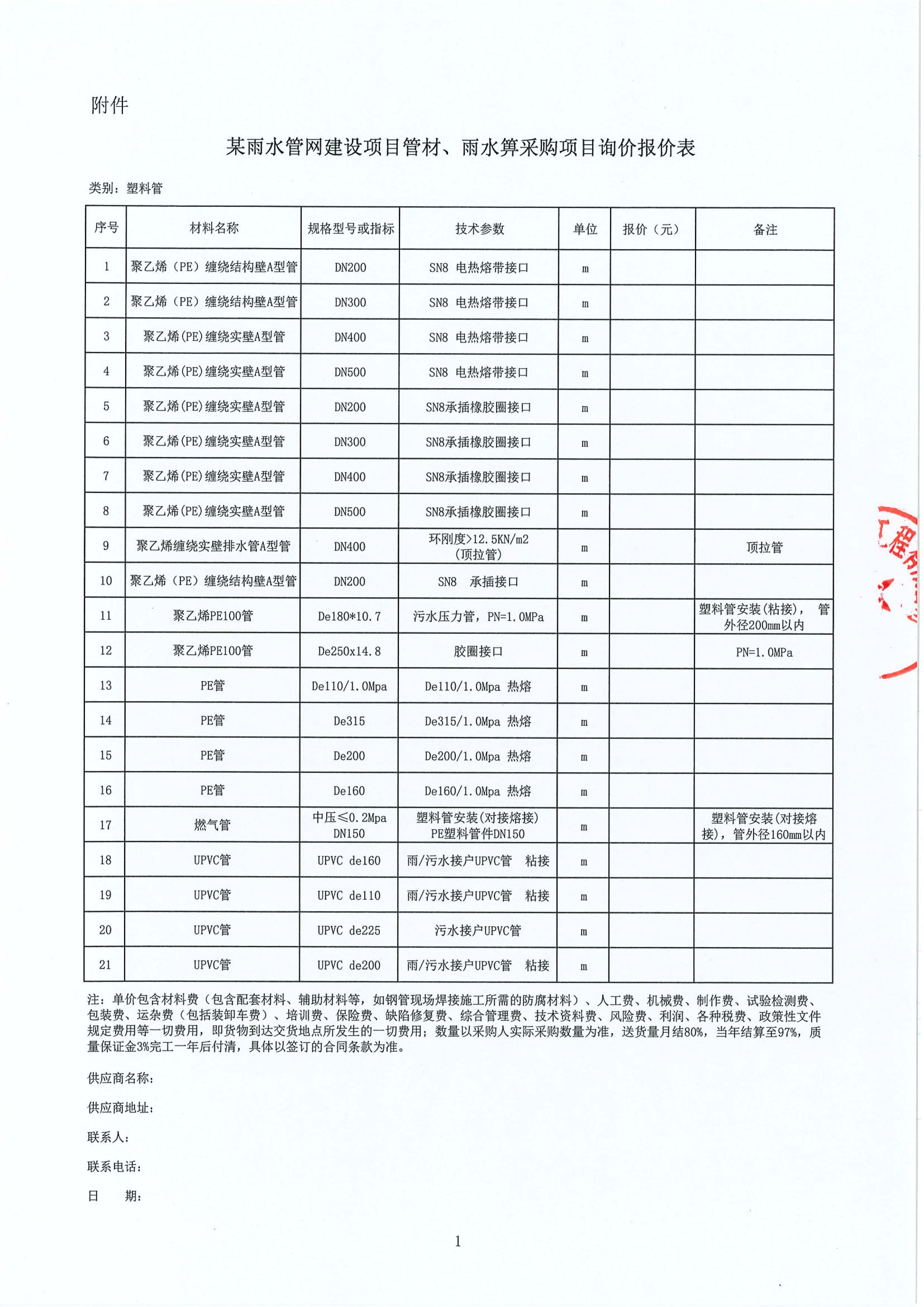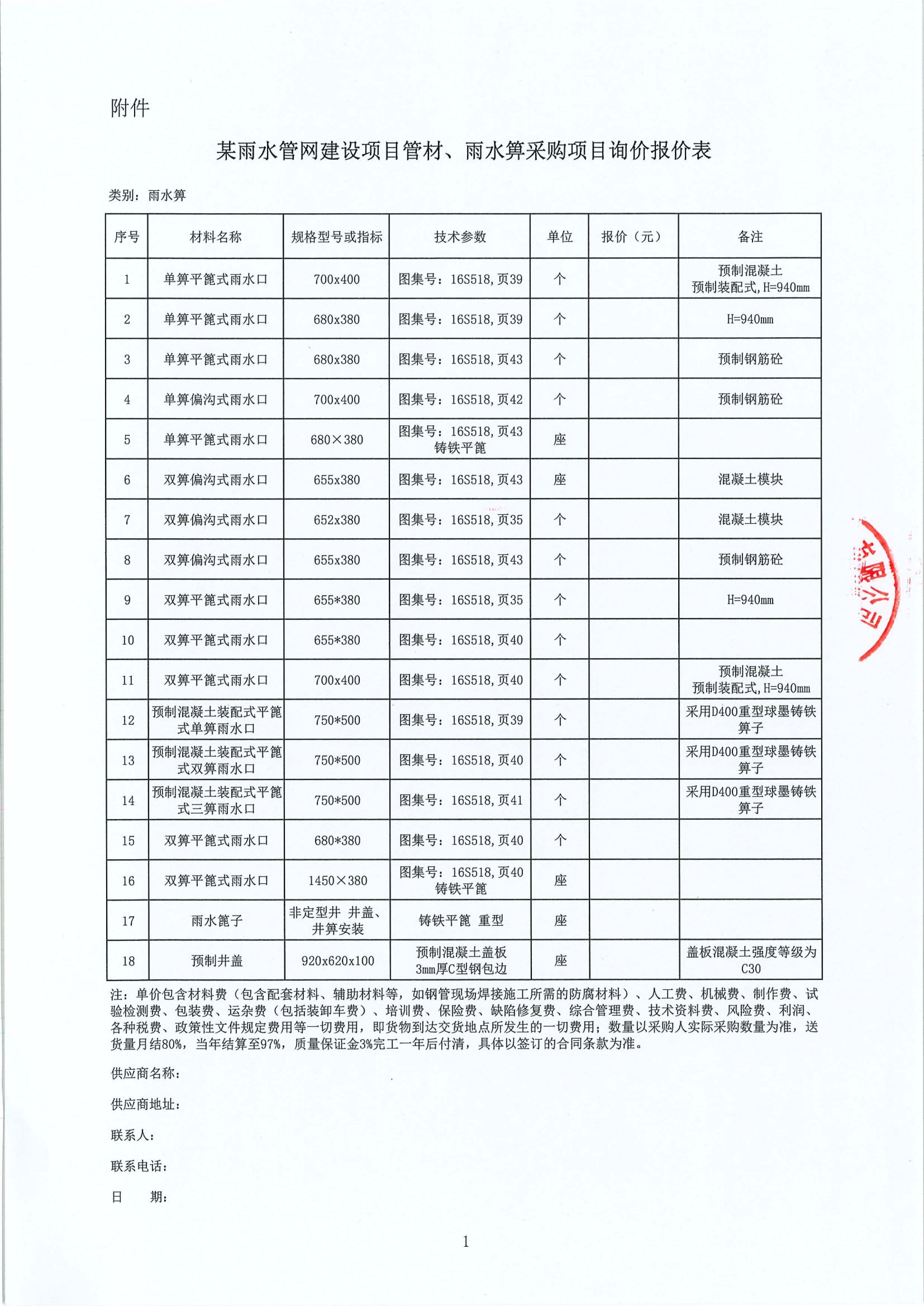 某雨水管網建設項目管材、雨水箅采購項目詢價公告附件: