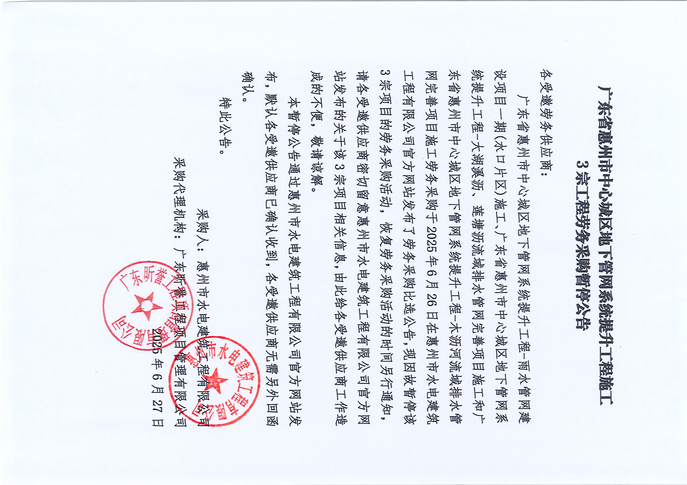 廣東省惠州市中心城區(qū)地下管網(wǎng)系統(tǒng)提升工程施工 3宗工程勞務(wù)采購(gòu)暫停公告