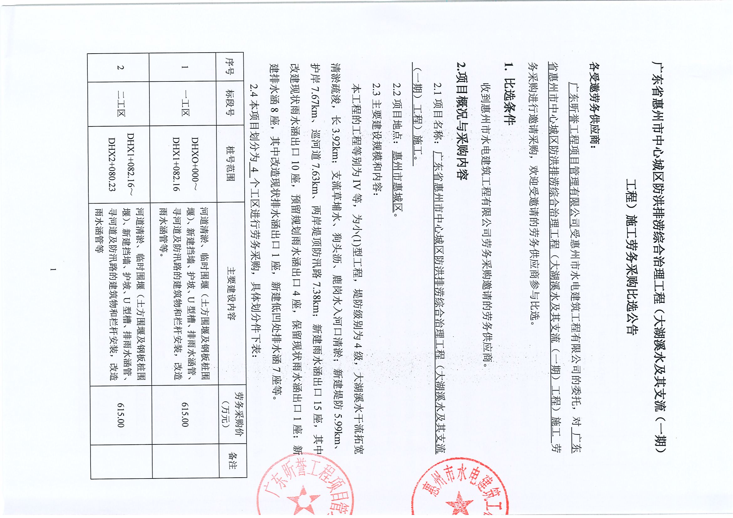 廣東省惠州市中心城區(qū)防洪排澇綜合治理工程(大湖溪水及其支流(一期)工程)施工勞務(wù)采購比選公告