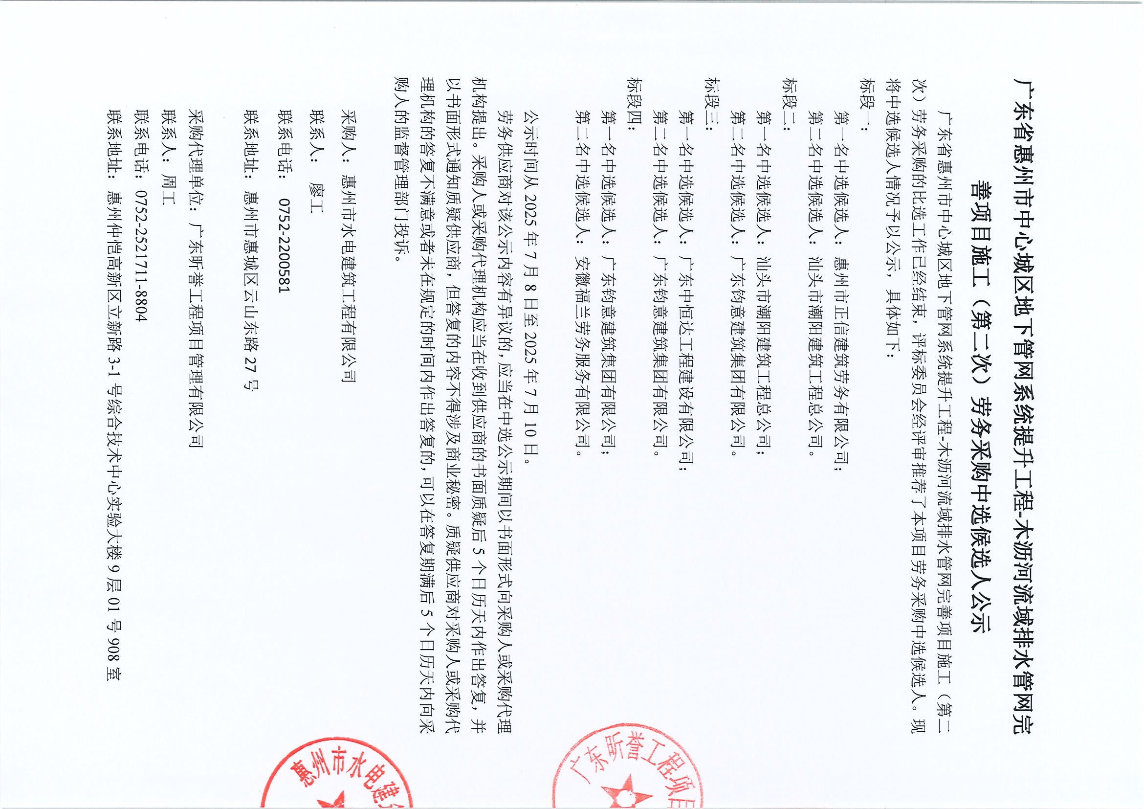 廣東省惠州市中心城區(qū)地下管網(wǎng)系統(tǒng)提升工程-木瀝河流域排水管網(wǎng)完善項(xiàng)目施工(第二次)勞務(wù)采購中選候選人公示