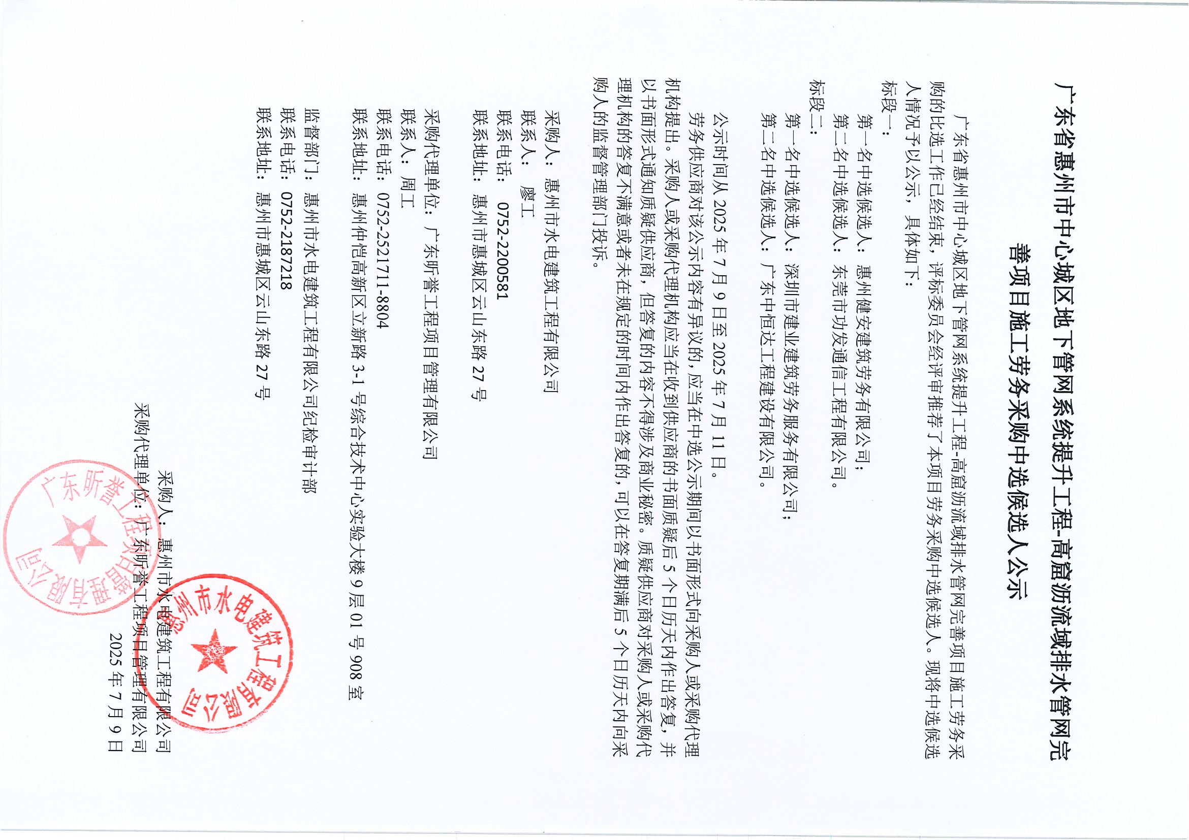 廣東省惠州市中心城區(qū)地下管網系統(tǒng)提升工程-高窟瀝流域排水管網完善項目施工勞務采購中選候選人公示