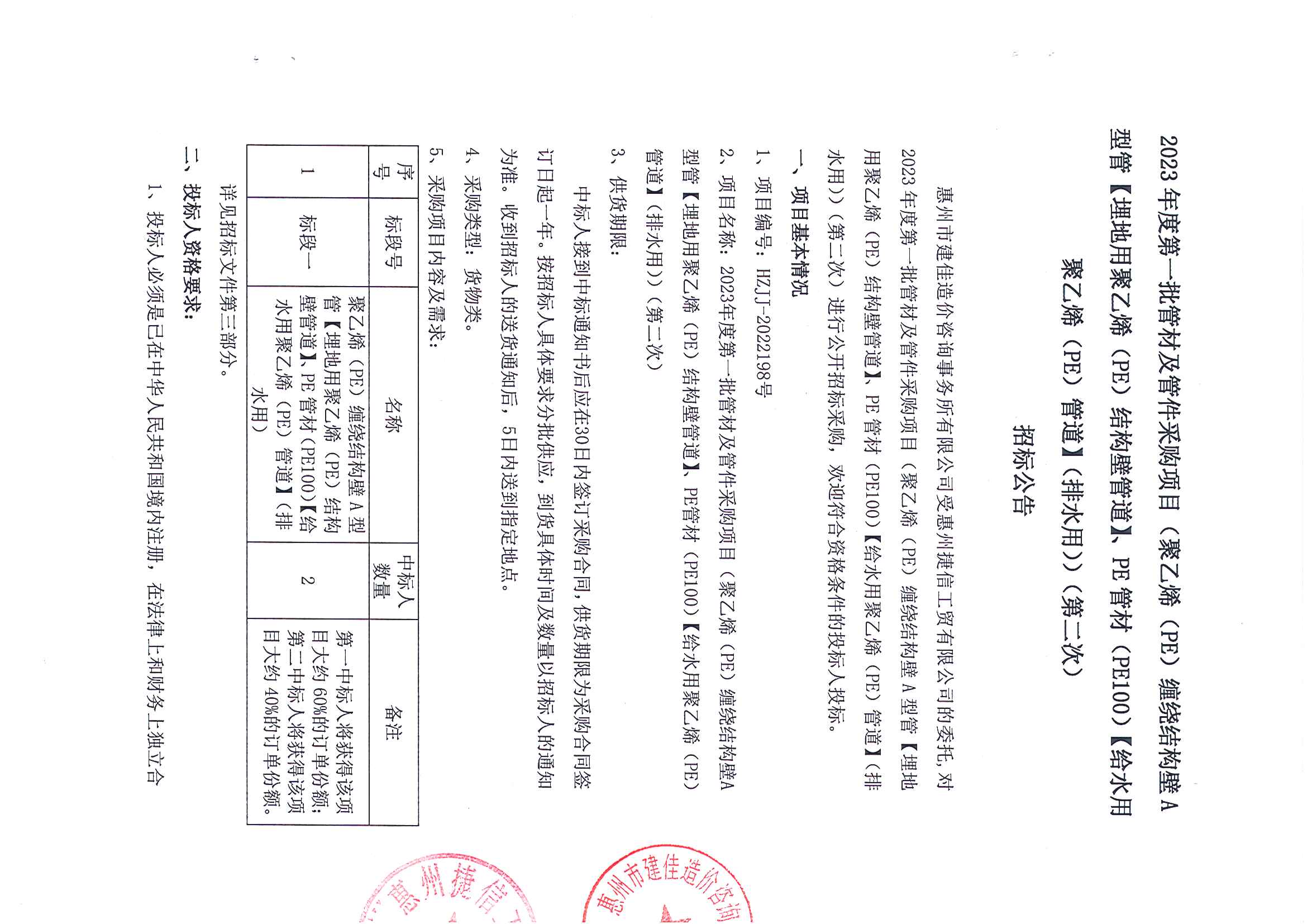 捷信工貿公司2023年度第一批管材及管件采購項目(標段一)(第二次)招標公告