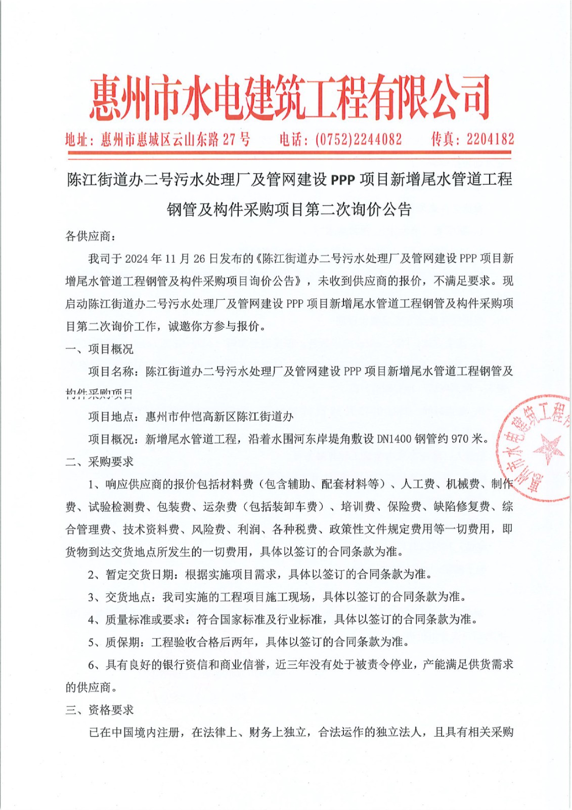 陳江街道辦二號(hào)污水處理廠及管網(wǎng)建設(shè)PPP項(xiàng)目新增尾水管道工程鋼管及構(gòu)件采購(gòu)項(xiàng)目第二次詢價(jià)公告附件:/upload/202412/09/202412091458001110.xls......