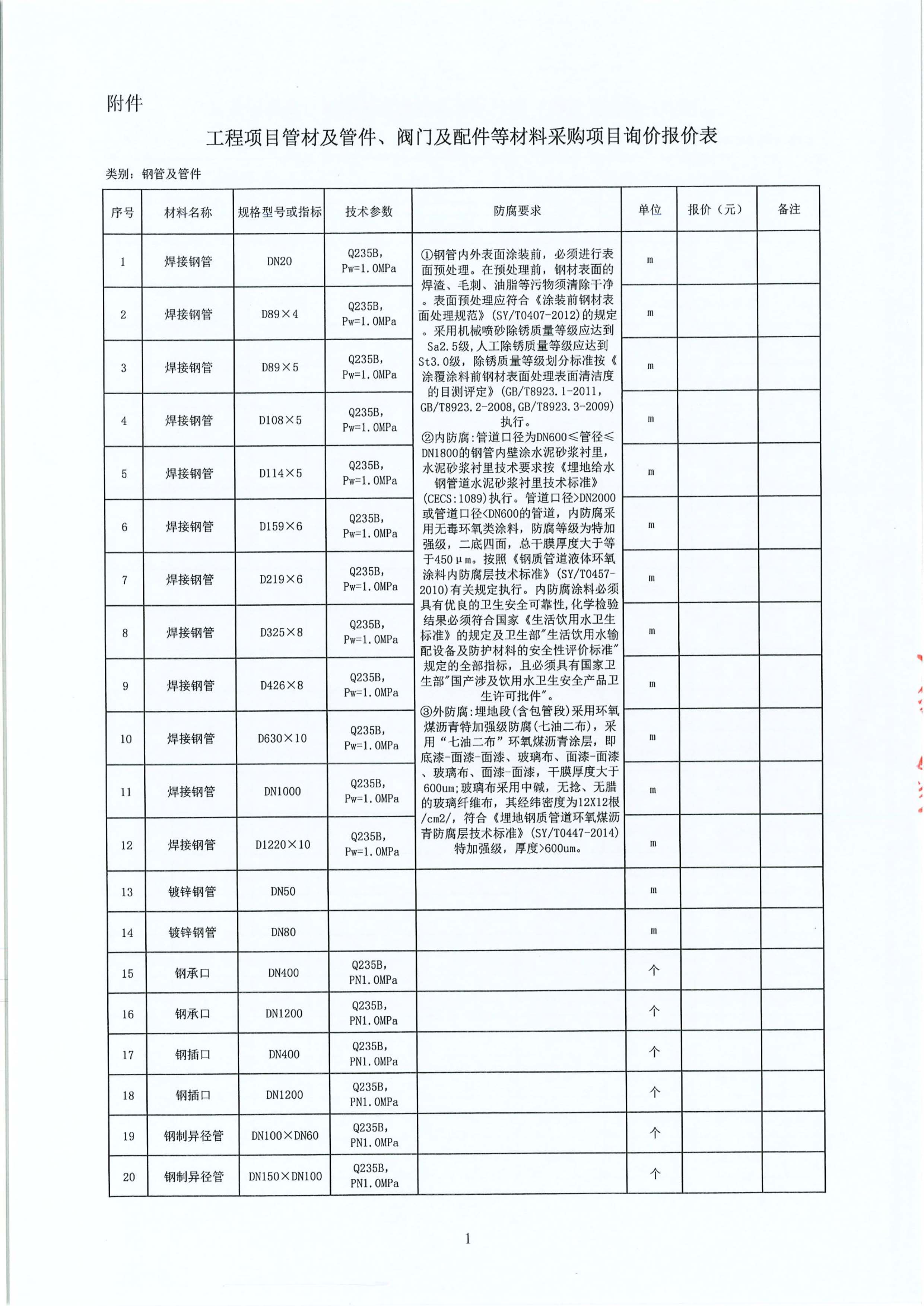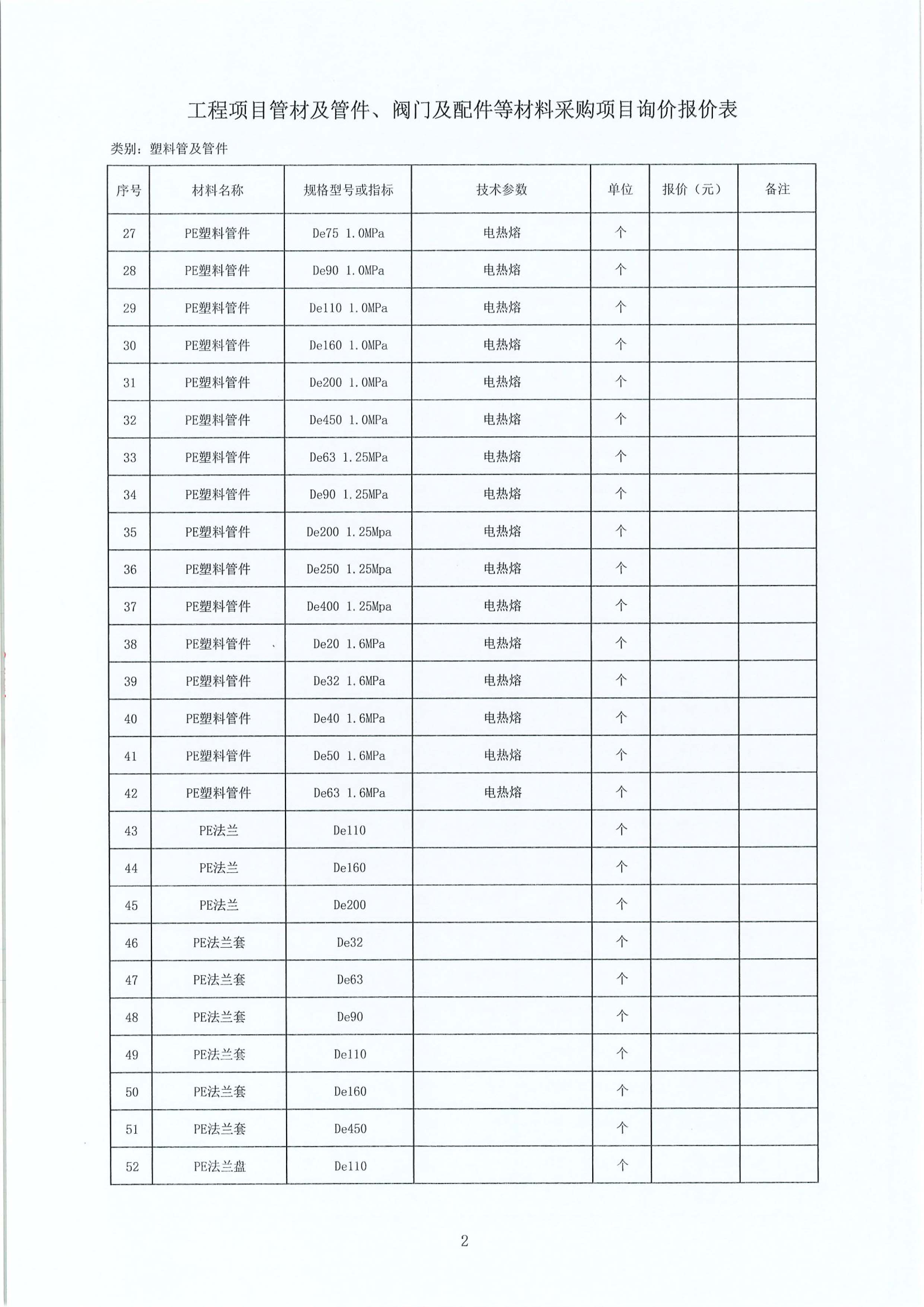 工程項(xiàng)目管材及管件、閥門及配件等材料采購項(xiàng)目詢價(jià)公告
