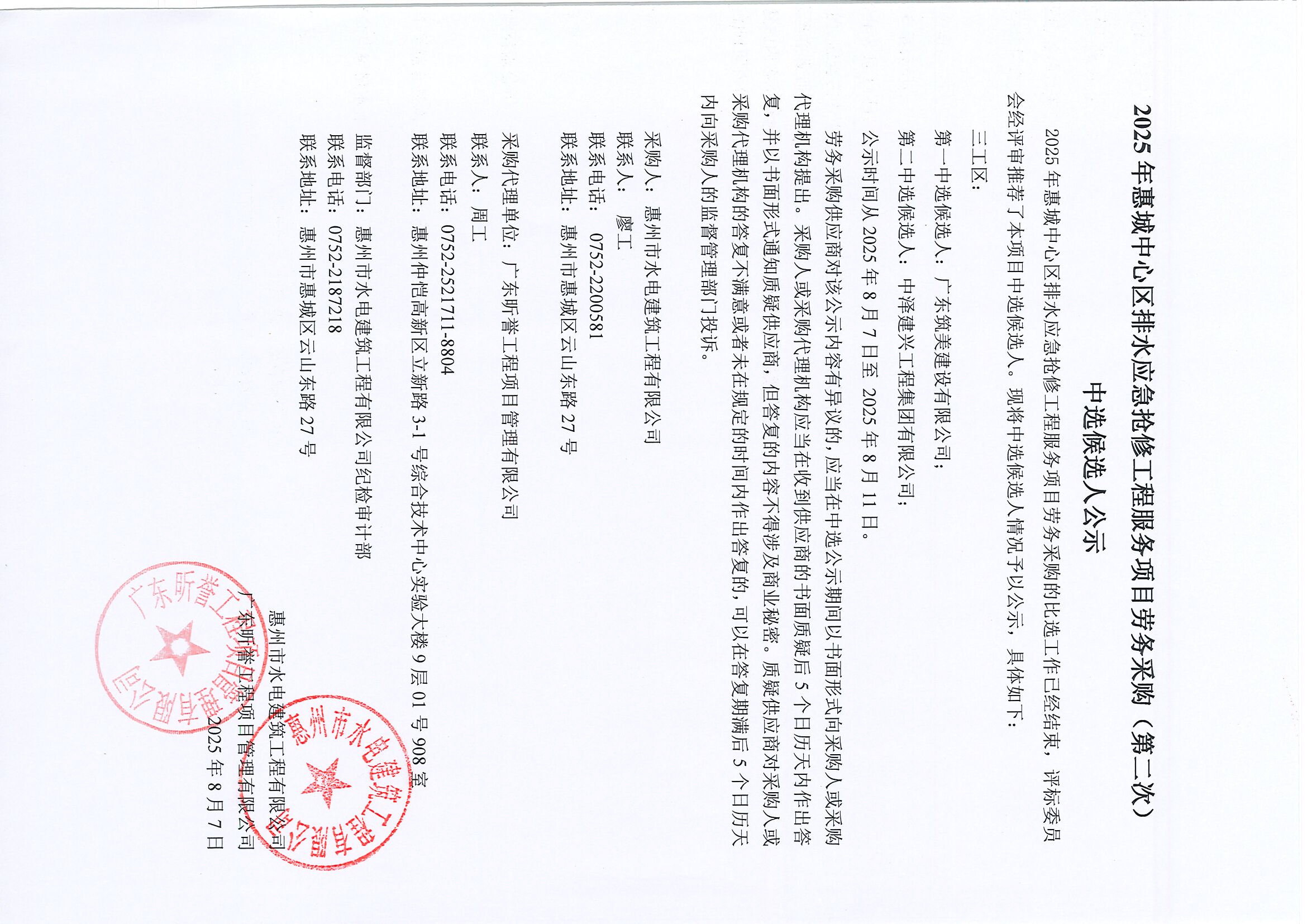 2025年惠城中心區(qū)排水應(yīng)急搶修工程服務(wù)項(xiàng)目勞務(wù)采購(gòu)(第二次)中選候選人公示