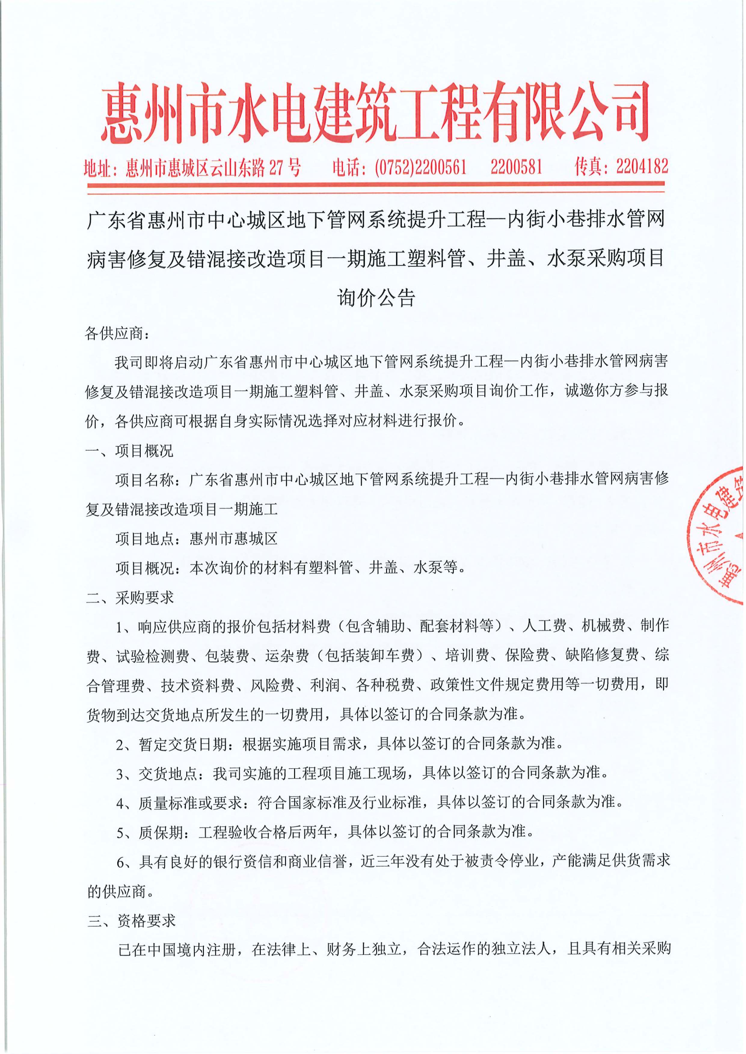 廣東省惠州市中心城區(qū)地下管網(wǎng)系統(tǒng)提升工程—內(nèi)街小巷排水管網(wǎng)病害修復(fù)及錯混接改造項目一期施工塑料管、井蓋、水泵采購項目詢價公告附件: