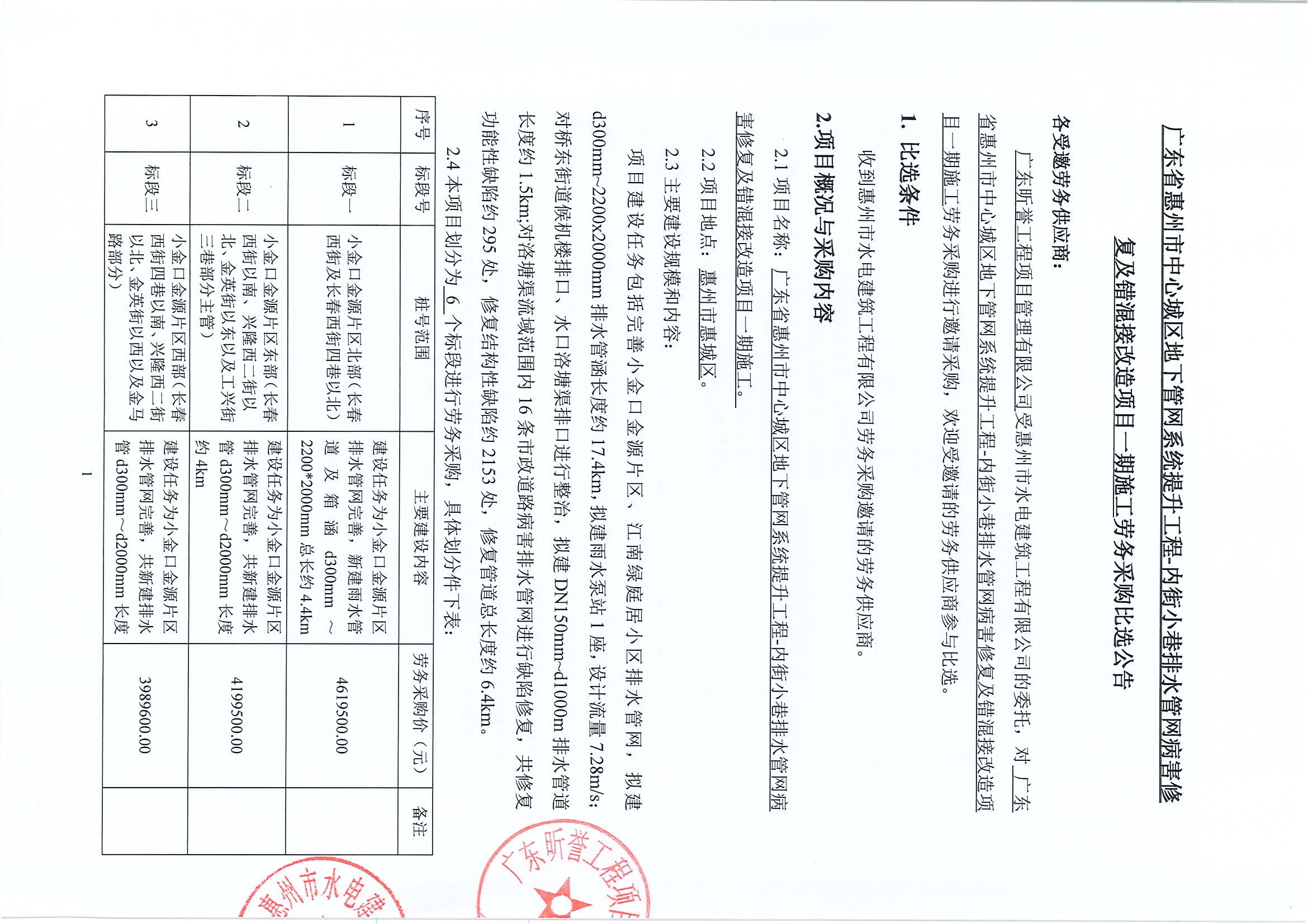廣東省惠州市中心城區(qū)地下管網(wǎng)系統(tǒng)提升工程-內(nèi)街小巷排水管網(wǎng)病害修復(fù)及錯(cuò)混接改造項(xiàng)目一期施工勞務(wù)采購比選公告