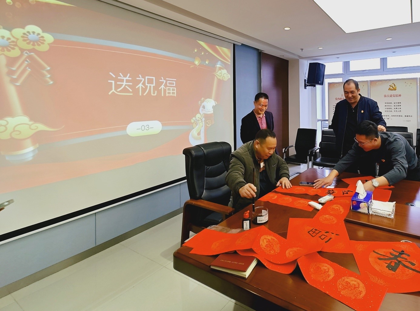 活動末尾,送祝福環(huán)節(jié)溫馨上演。黨員們揮毫潑墨,書寫迎春祝福語,“金蟒迎春心守廉,紅梅映日夢留清”“風清氣正度佳節(jié),吉祥如意迎新春”等飽含深意的話語躍然紙上。這些書法作品,既傳遞新春祝福,也時刻提醒黨員堅守廉潔底線,共度清正春節(jié)。