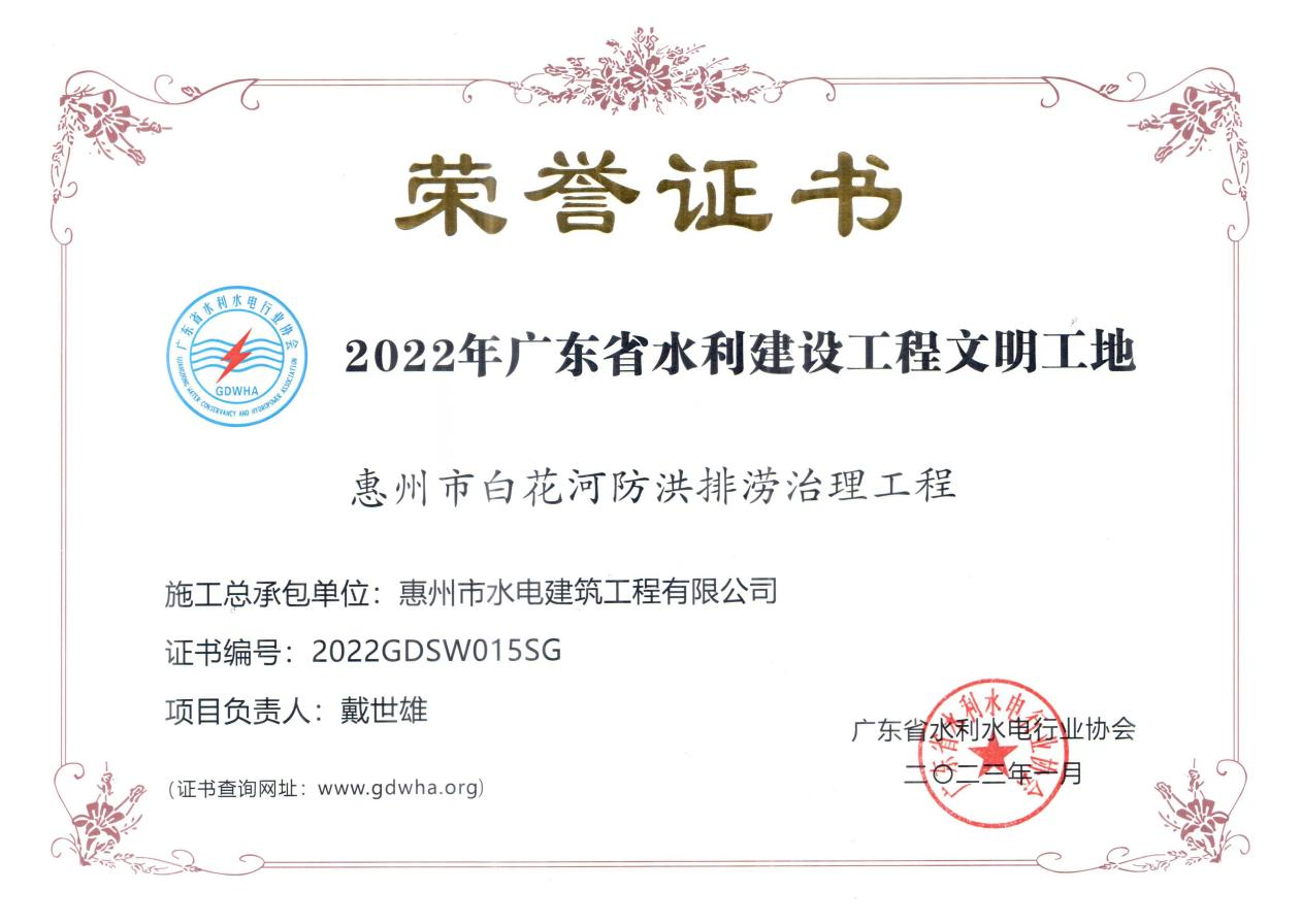 廣東省水利建設(shè)工程文明工地——惠州市白花河防洪排澇治理工程
