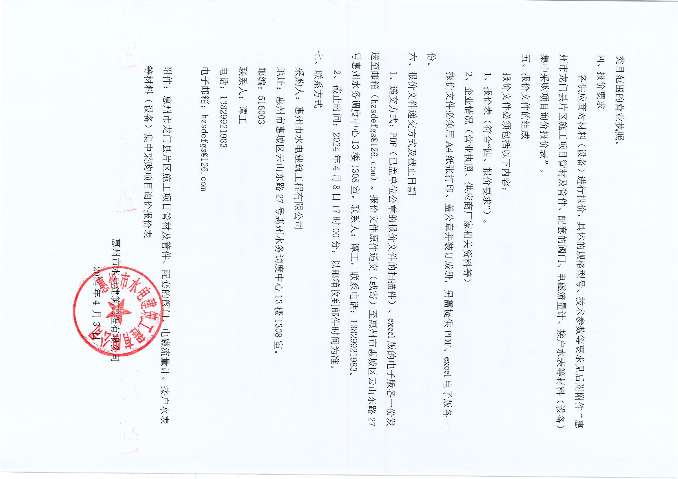 惠州市龍門縣片區(qū)施工項目管材及管件、配套的閥門、電磁流量計、接戶水表等材料(設備)集中采購項目詢價公告