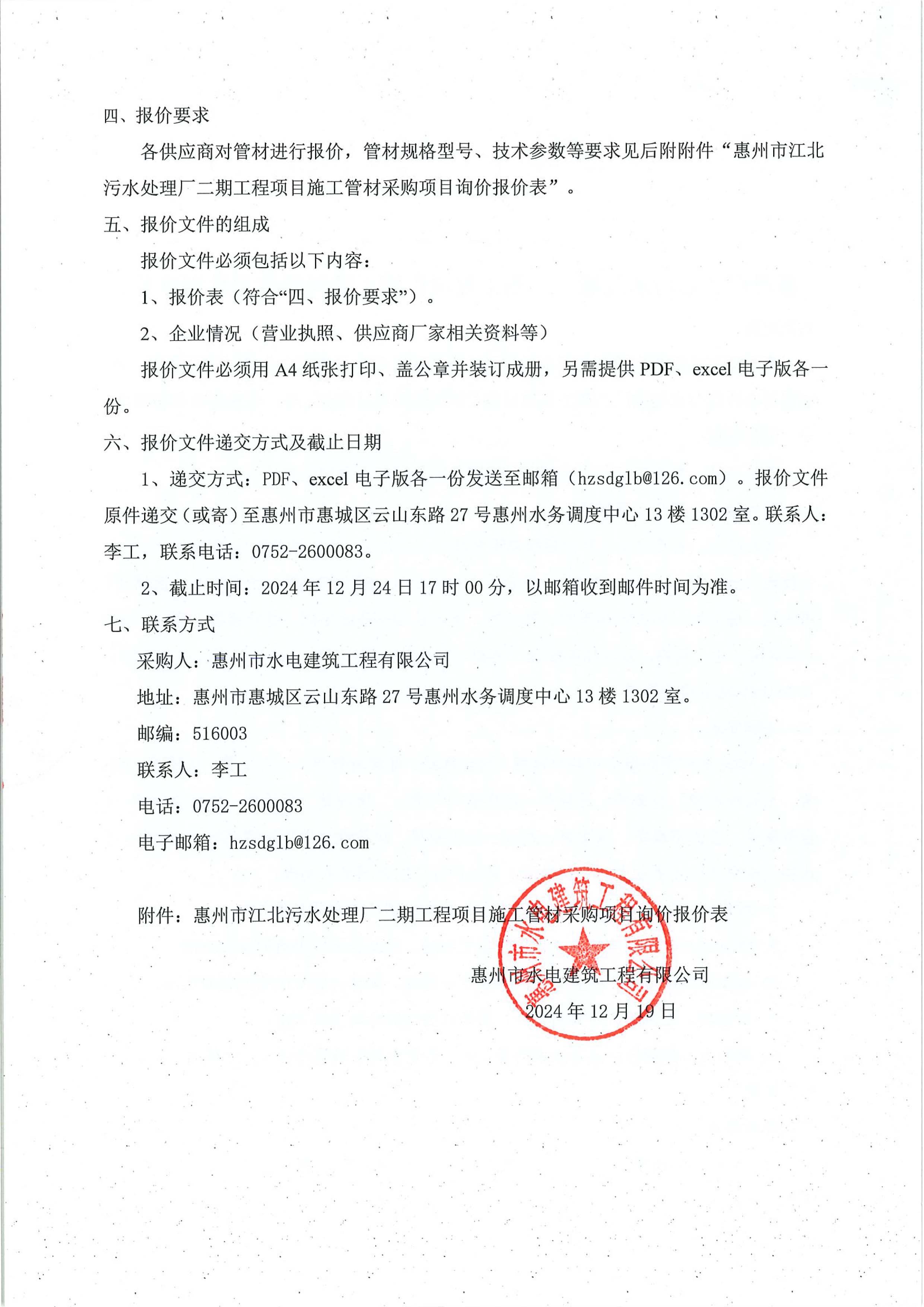 惠州市江北污水處理廠二期工程項(xiàng)目施工管材采購(gòu)項(xiàng)目詢價(jià)公告
