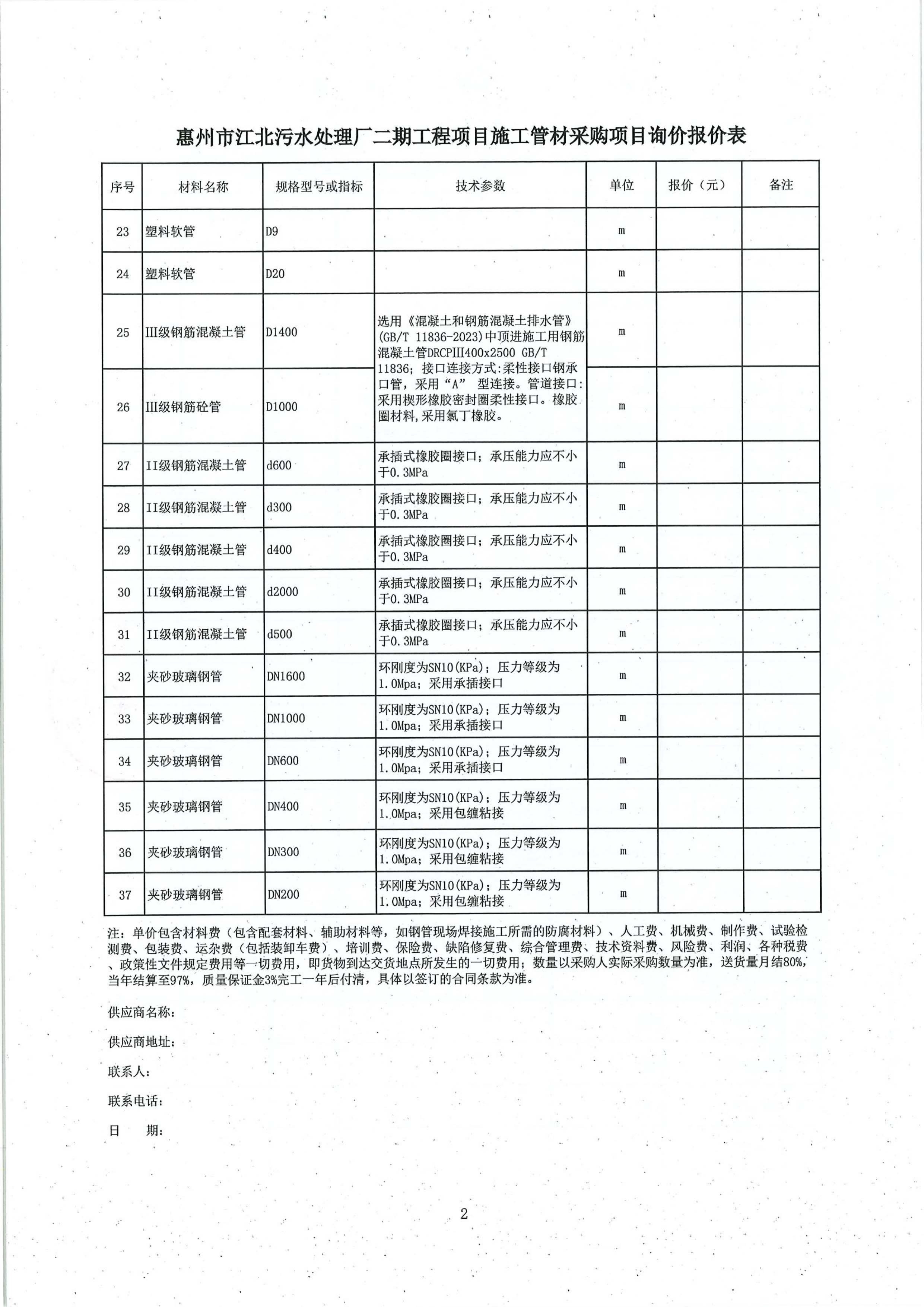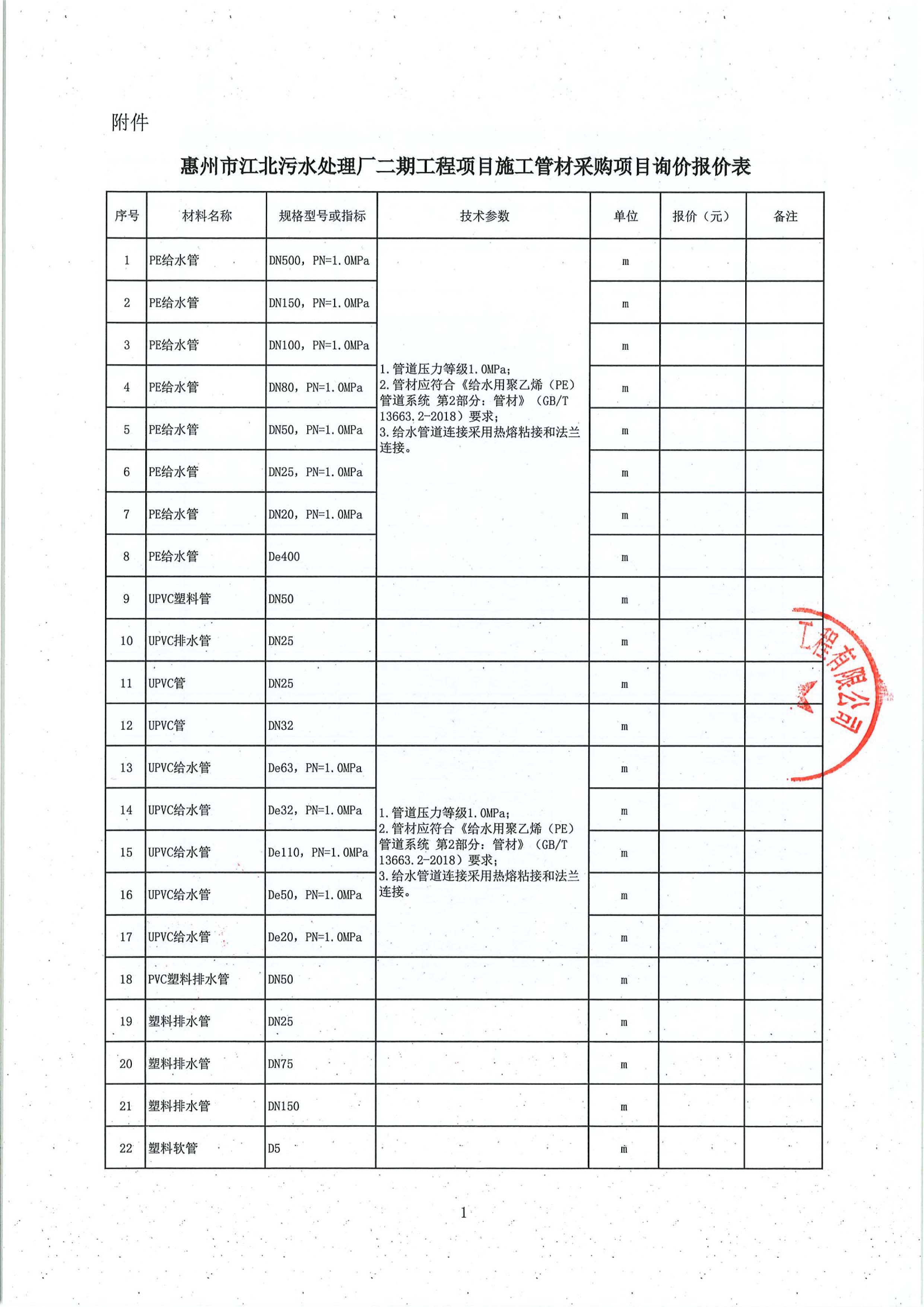 附件:惠州市江北污水處理廠二期工程項(xiàng)目施工管材采購(gòu)項(xiàng)目詢價(jià)報(bào)價(jià)表