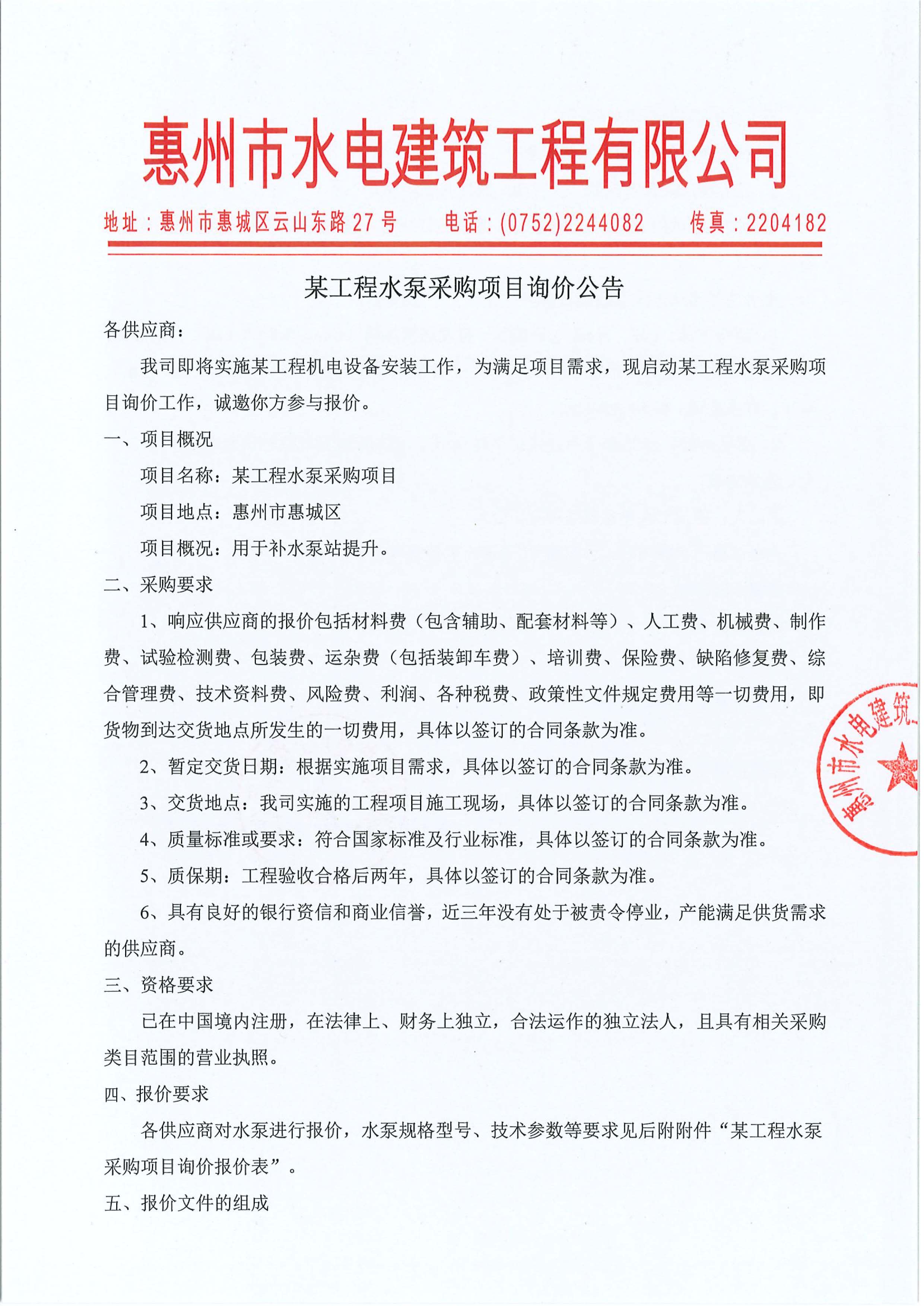 某工程水泵采購(gòu)項(xiàng)目詢價(jià)公告