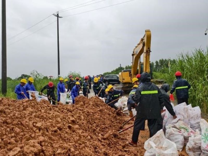 在潼湖崗頭新圍,8月5日早上,公司接到赴潼湖崗頭新圍搶險命令,搶險隊70人立即集結(jié)待命,完成應(yīng)急搶險安全技術(shù)交底工作后乘車前往仲愷高新區(qū)潼湖崗頭新圍開展子堤加高加固搶險。公司總工程師謝武帶隊趕赴險情現(xiàn)場勘查,研討搶險方案,指導搶險工作。12時30分,搶險人員、機械設(shè)備和搶險物資已到達現(xiàn)場第一作業(yè)點開展搶險。因連日降雨,現(xiàn)場河水水位高漲幾近漫堤,險情非常緊急。搶險隊員或鏟裝沙袋、或搬運堆砌、或機械清障,大家分工協(xié)作,有條不紊開展子堤加高。經(jīng)過全員不懈努力,僅用4個小時,第一搶險點子堤加高加固就已完成,順利完成搶險任務(wù)。