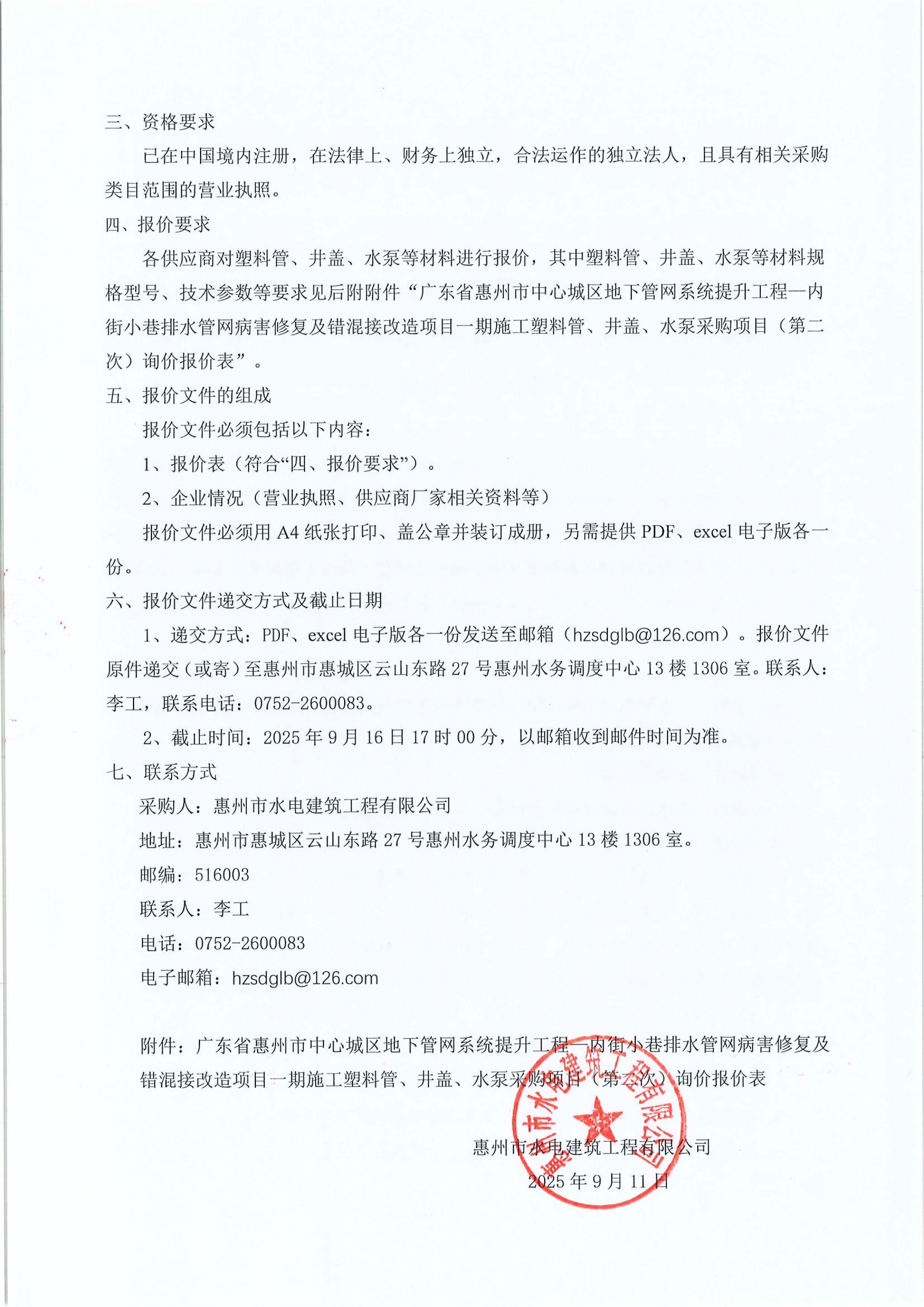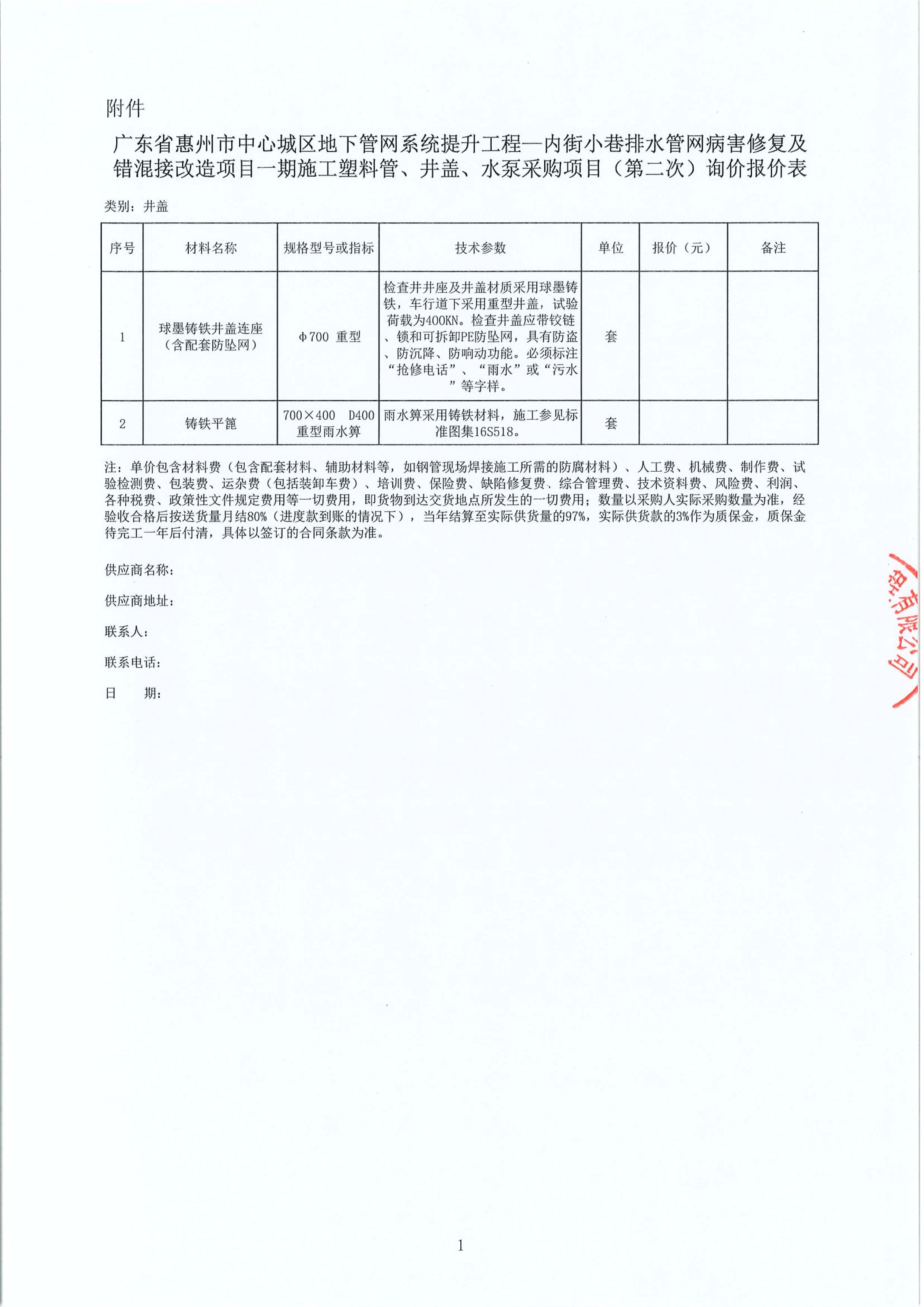 廣東省惠州市中心城區(qū)地下管網(wǎng)系統(tǒng)提升工程—內(nèi)街小巷排水管網(wǎng)病害修復(fù)及錯(cuò)混接改造項(xiàng)目一期施工塑料管、井蓋、水泵采購項(xiàng)目(第二次)詢價(jià)公告附件: