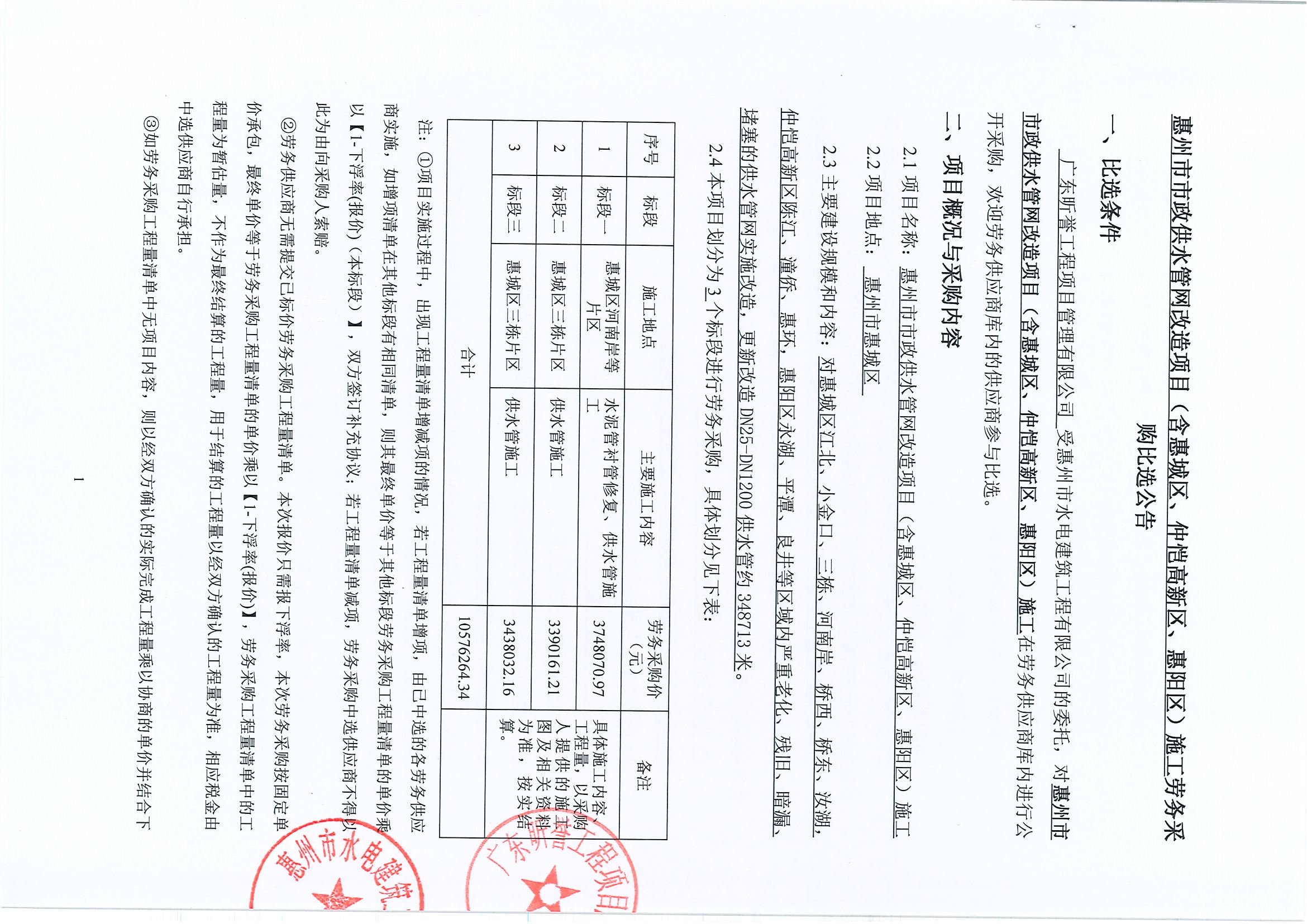 惠州市市政供水管網(wǎng)改造項目(含惠城區(qū)、仲愷高新區(qū)、惠陽區(qū))施工勞務(wù)采購比選公告