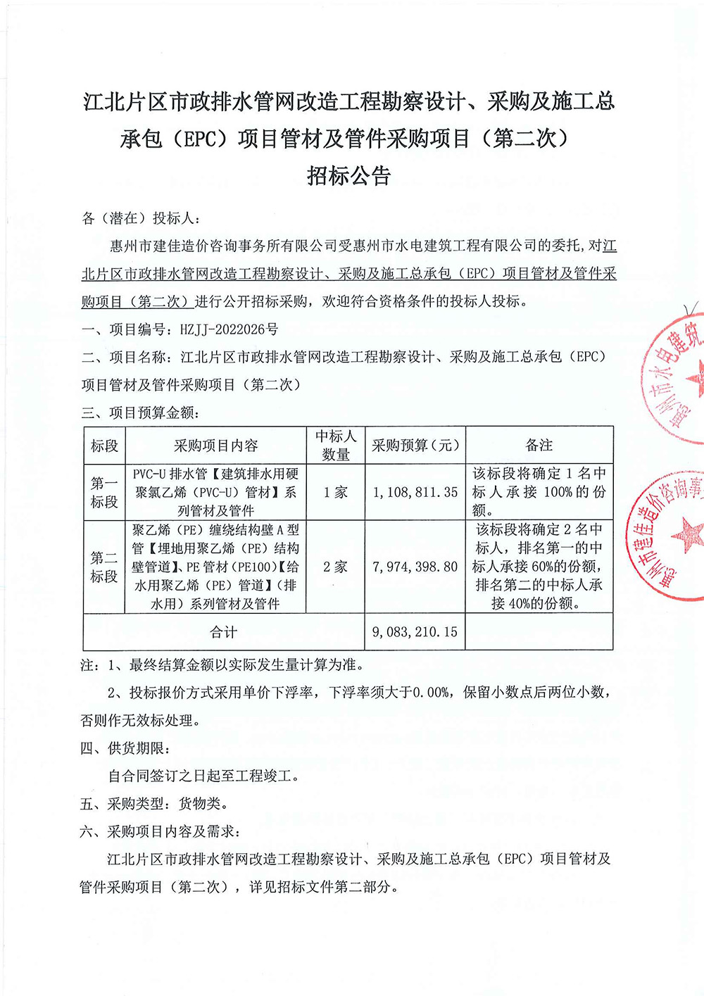 江北片區(qū)市政排水管網(wǎng)改造工程勘察設(shè)計、采購及施工總承包(EPC)項目管材及管件采購項目(第二次)招標(biāo)公告