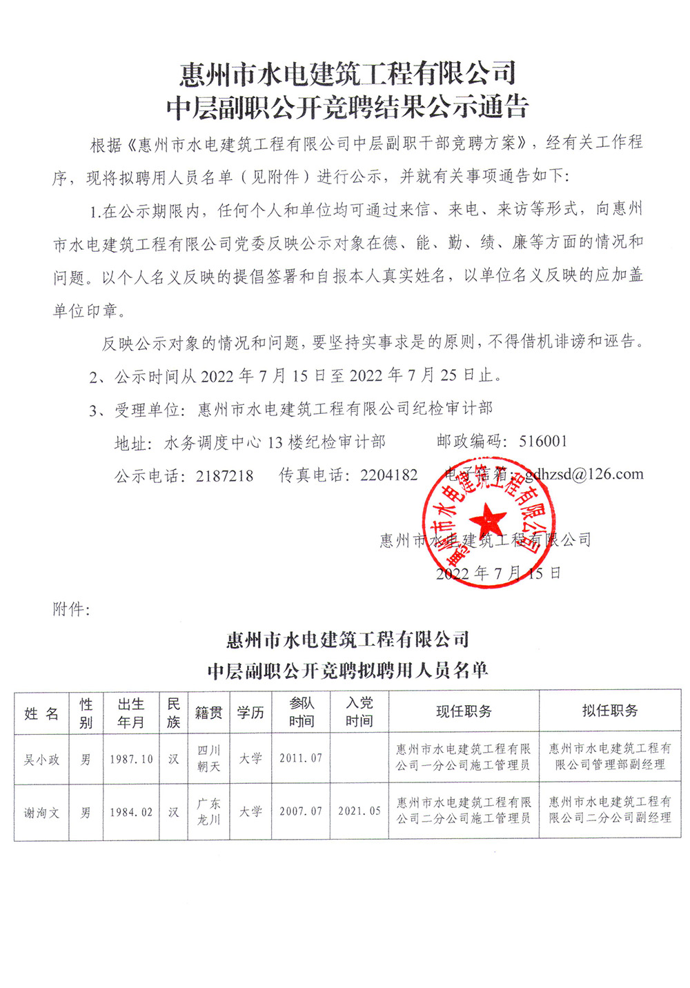 惠州市水電建筑工程有限公司中層副職公開競聘結(jié)果公示