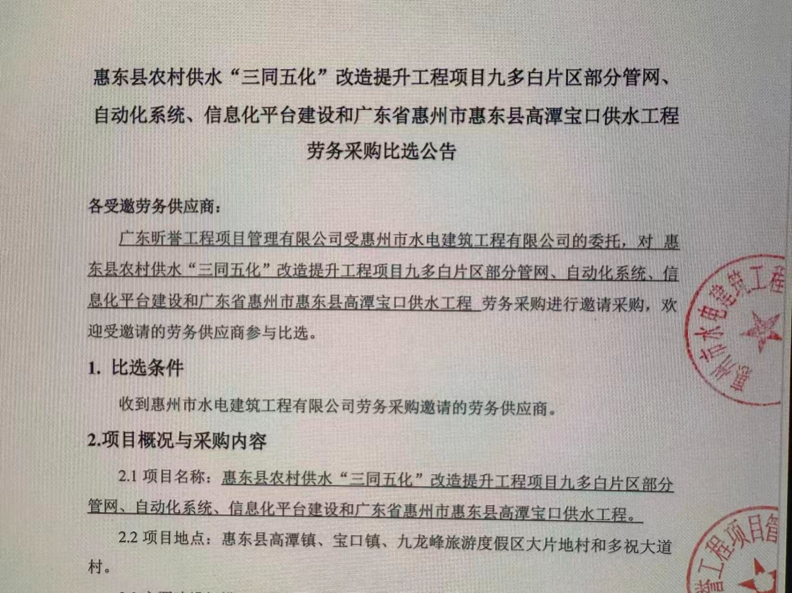 惠東縣農(nóng)村供水“三同五化”改造提升工程項(xiàng)目九多白片區(qū)部分管網(wǎng)、自動化系統(tǒng)、信息化平臺建設(shè)和廣東省惠州市惠東縣高潭寶口供水工程勞務(wù)采購比選公告......