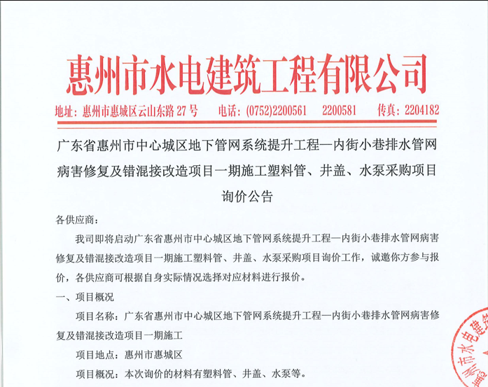 廣東省惠州市中心城區(qū)地下管網(wǎng)系統(tǒng)提升工程—內(nèi)街小巷排水管網(wǎng)病害修復(fù)及錯(cuò)混接改造項(xiàng)目一期施工塑料管、井蓋、水泵采購項(xiàng)目詢價(jià)公告......