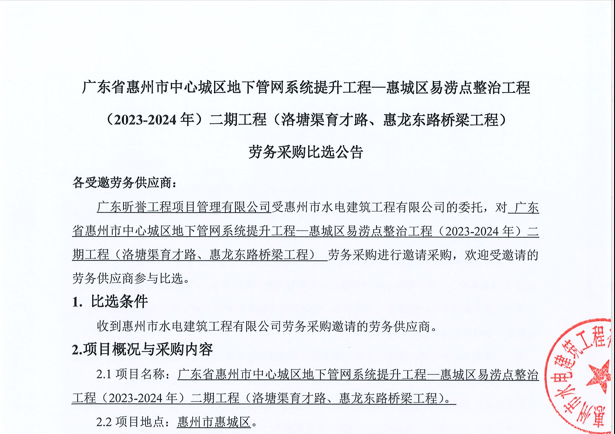 廣東省惠州市中心城區(qū)地下管網(wǎng)系統(tǒng)提升工程—惠城區(qū)易澇點(diǎn)整治工程(2023-2024年)二期工程(洛塘渠育才路、惠龍東路橋梁工程)勞務(wù)采購比選公告......