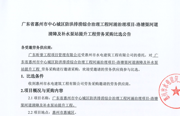 廣東省惠州市中心城區(qū)防洪排澇綜合治理工程河涌治理項(xiàng)目-洛塘渠河道清障及補(bǔ)水泵站提升工程勞務(wù)采購比選公告......