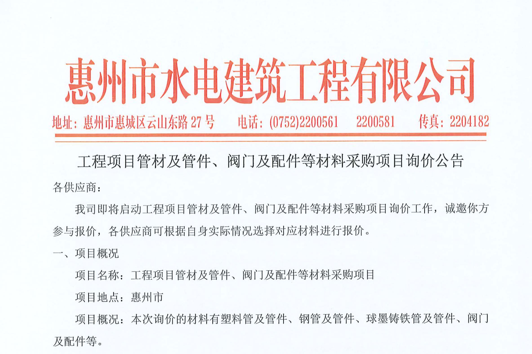工程項目管材及管件、閥門及配件等材料采購項目詢價公告......