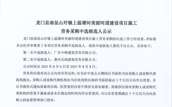 龍門縣南昆山圩鎮(zhèn)上溫塘河美麗河道建設(shè)項目施工勞務(wù)采購中選候選人公示......