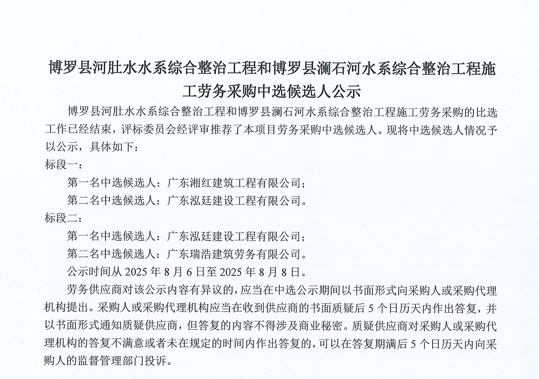 博羅縣河肚水水系綜合整治工程和博羅縣瀾石河水系綜合整治工程施工勞務(wù)采購中選候選人公示......