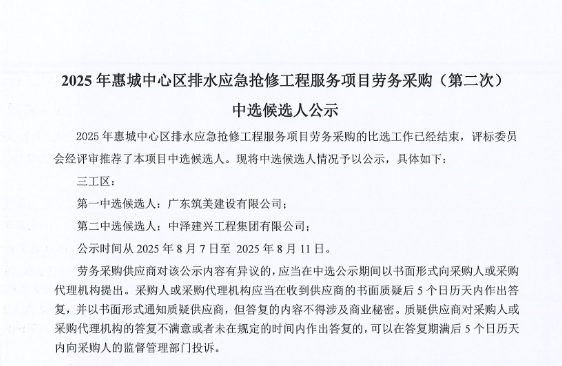 2025年惠城中心區(qū)排水應(yīng)急搶修工程服務(wù)項目勞務(wù)采購(第二次)中選候選人公示......