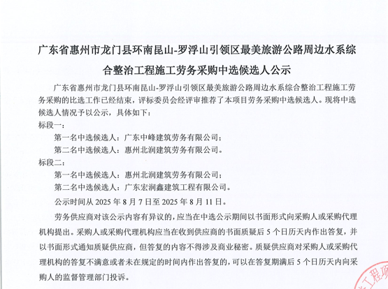廣東省惠州市龍門縣環(huán)南昆山-羅浮山引領(lǐng)區(qū)最美旅游公路周邊水系綜合整治工程施工勞務(wù)采購中選候選人公示......