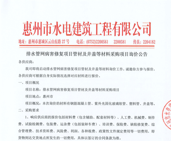 排水管網(wǎng)病害修復(fù)項目管材及井蓋等材料采購項目詢價公告......