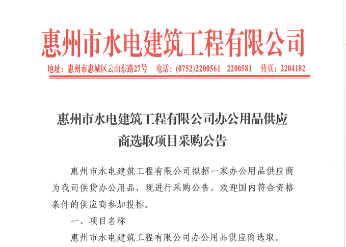 惠州市水電建筑工程有限公司辦公用品供應(yīng)商選取項目采購公告......