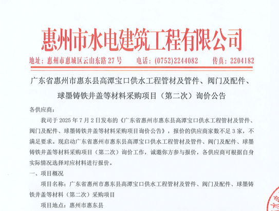 廣東省惠州市惠東縣高潭寶口供水工程施工管材及管件、閥門及配件、球墨鑄鐵井蓋等材料采購項目(第二次)詢價公告......