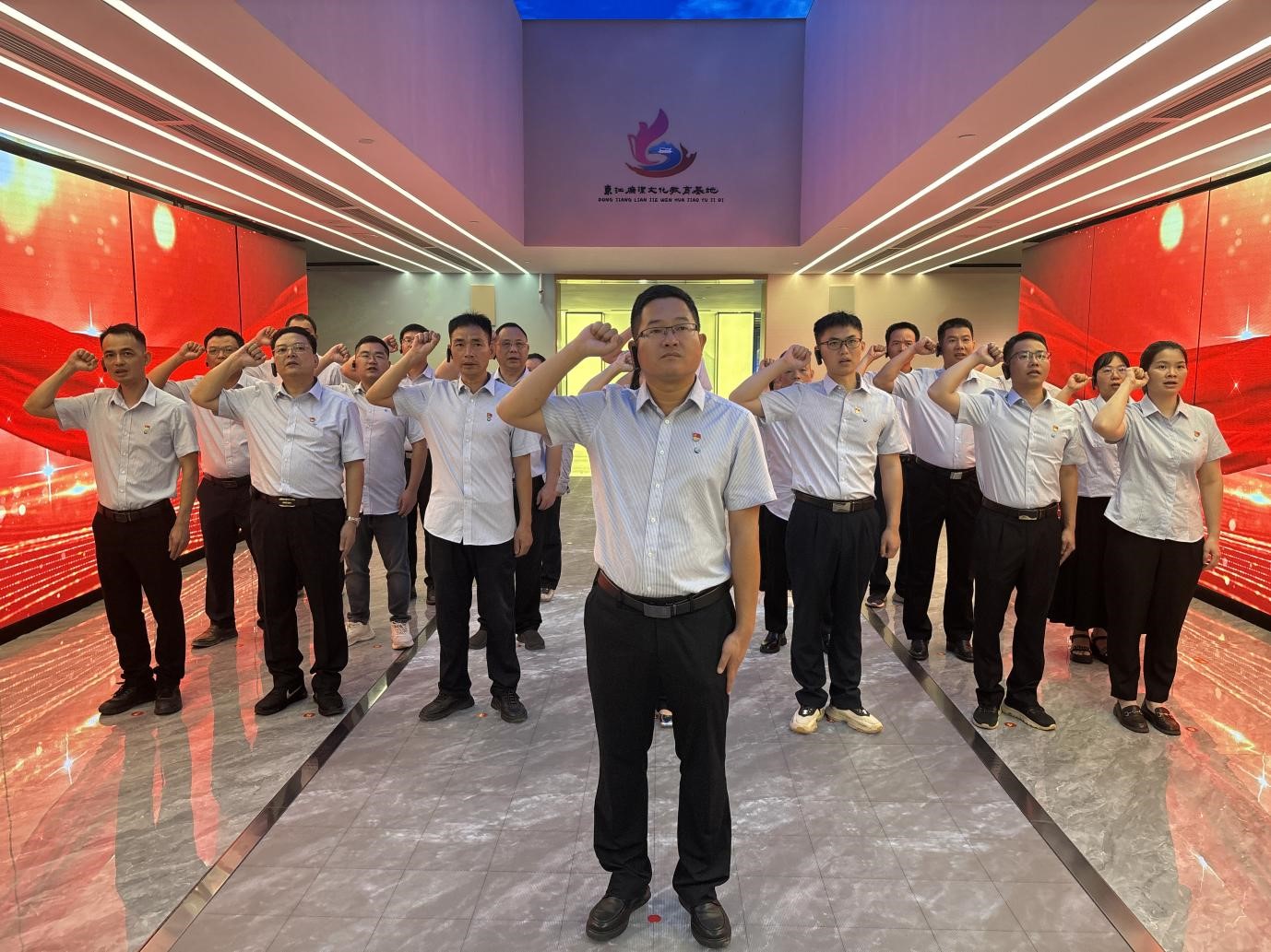 在最后宣誓環(huán)節(jié),全體黨員面對鮮紅的黨旗,高舉右拳,在施工一隊支部書記李雪川的帶領(lǐng)下莊嚴(yán)宣誓:“我志愿加入中國共產(chǎn)黨,擁護黨的綱領(lǐng),遵守黨的章程……”鏗鏘有力的誓言在展廳內(nèi)回蕩,表達了黨員們堅守廉潔底線、永葆政治本色的堅定決心。